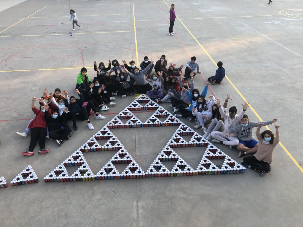 La part més vivencial del projecte ha sigut la construcció d’un triangle de Sierpinski de llaunes. Dibuixem, calculem i entenem el que anem a construir. Contem les llaunes que necessitem i calculem l’alçada que tindrà amb el teorema de Pitàgores, parlem i ens organitzem per aconseguir el nostre objectiu: 729 llaunes.