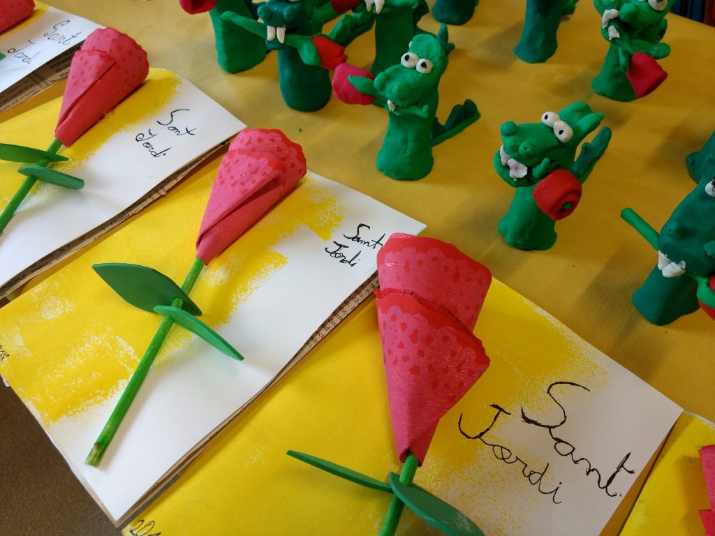 Els alumnes de 3r hem preparat l’arribada de Sant Jordi fent una postal amb un poema, una rosa i un drac! També hem explicat la llegenda de Sant Jordi amb una auca!
