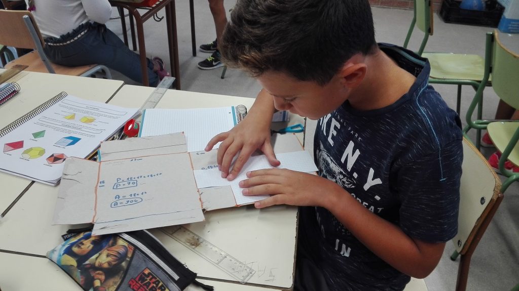 Cada alumne va dissenyar un cub de forma individual en paper (dues dimensions) i després va construir la figura en tres dimensions. També vam poder identificar les arestes, cares, vèrtexs, costats, etc.