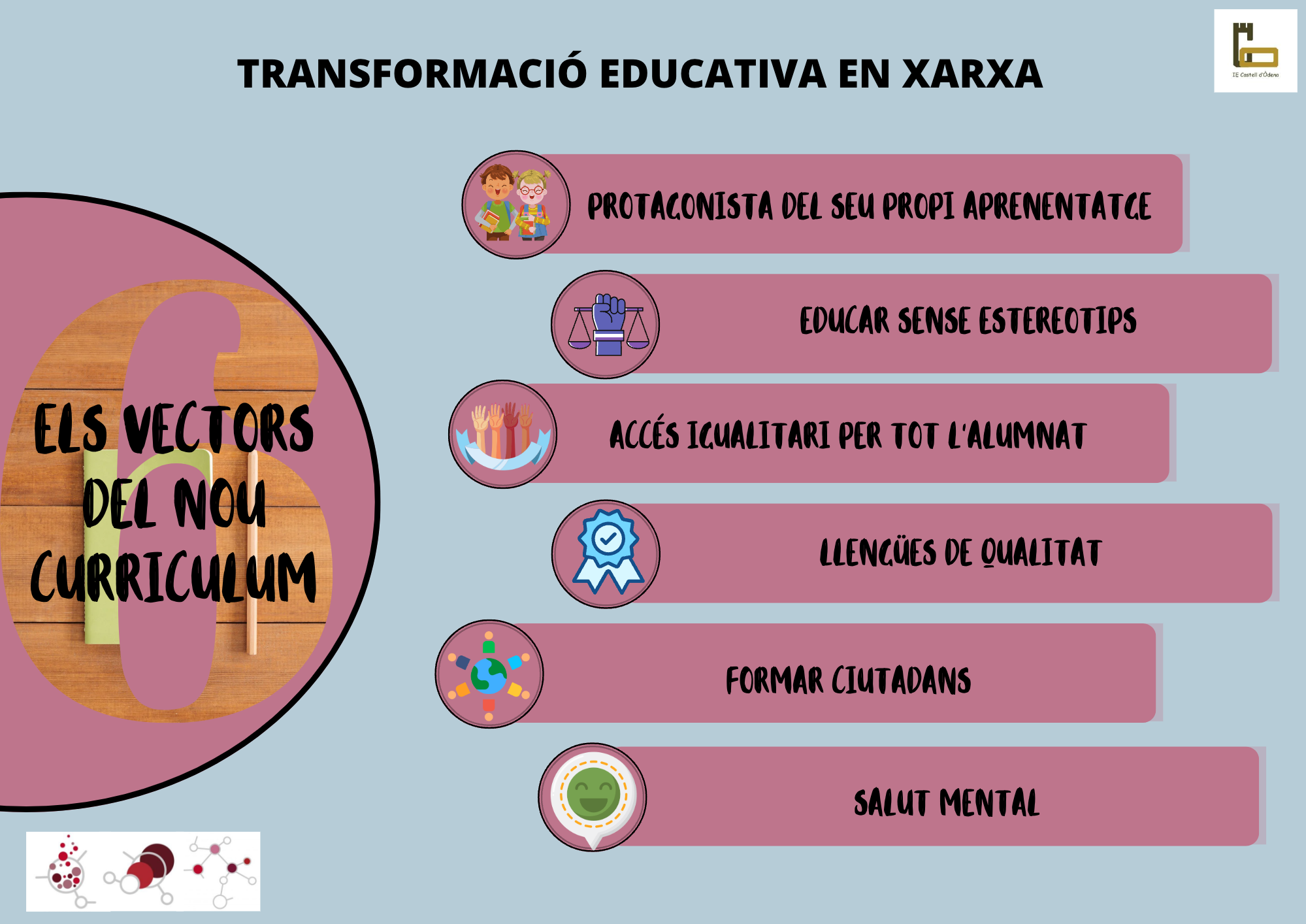 Els últims cursos han anat enfocats en la transformació educativa dels centres cap a la visió global que ens ofereix el nou Currículum d’Educació Bàsica. Aquest fa èmfasi en aprofundir en l’enfocament competencial, compartint significats i avançant en la mateixa línia de treball, vinculant l’alumnat al seu aprenentatge i donant sentit als continguts que es treballen.