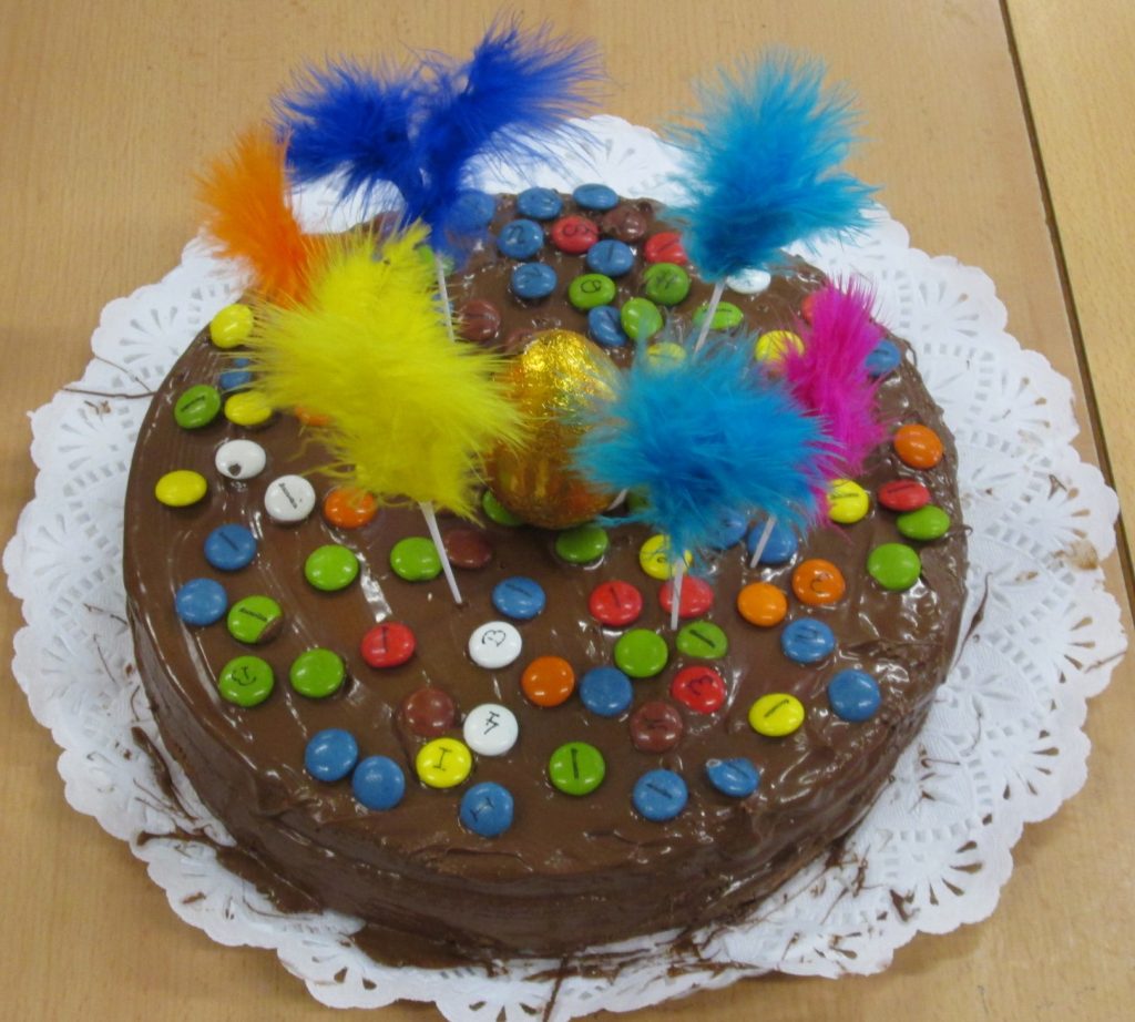 Les nenes i els nens de P4 ja tenim la mona feta. Després d’untar el pastís amb xocolata i melmelada,