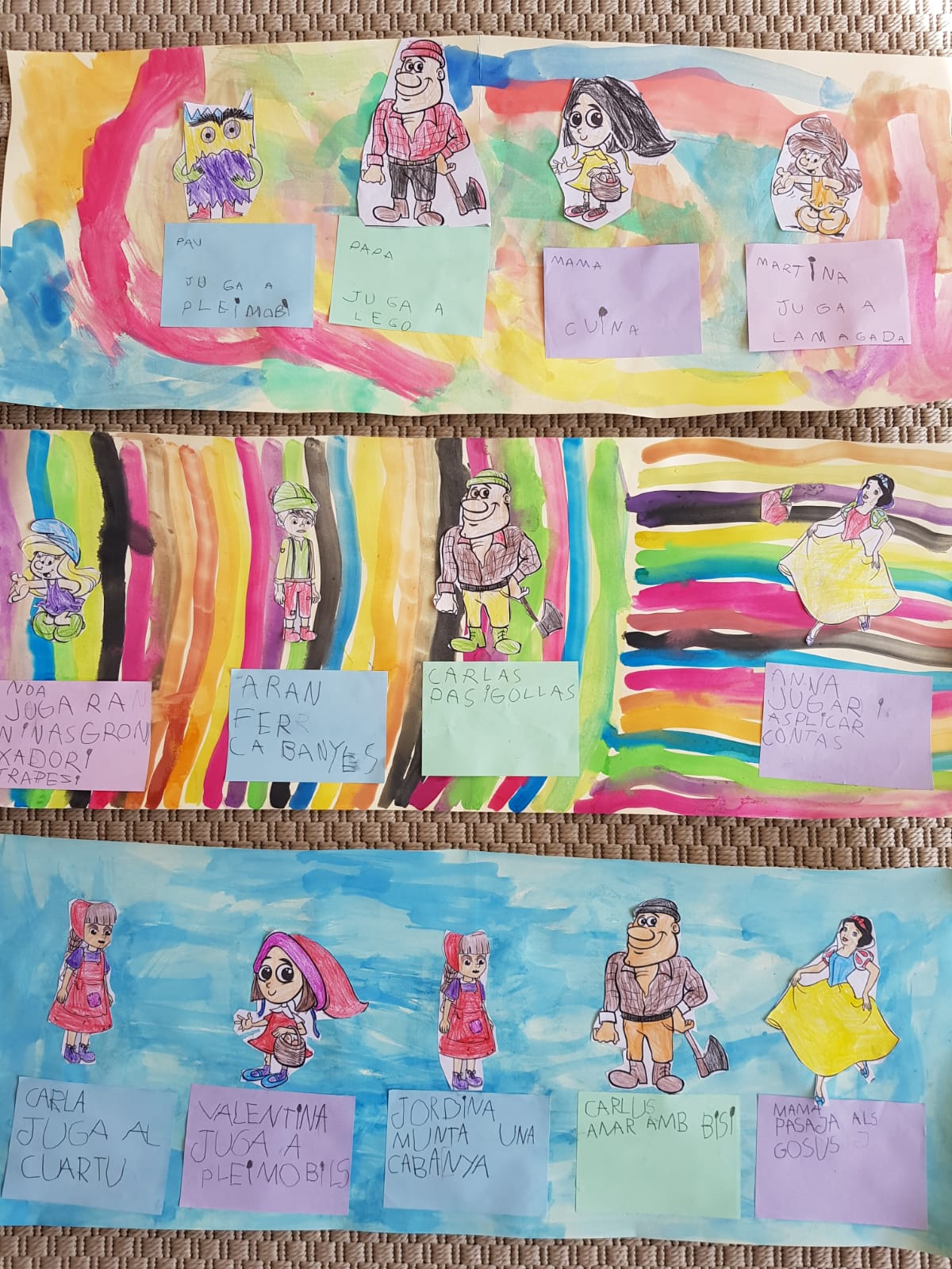 AQUESTS DIES HEM PRESENTAT LES NOSTRES FAMÍLIES A PARTIR DE PERSONATGES DE CONTE. I TAMBÉ HEM EXPLICAT QUÈ ENS AGRADAVA FER DURANT EL CONFINAMENT AMB EL PARE, LA MARE, ELS GERMANS, LES GERMANES, ELS AVIS, LES ÀVIES O ELS ANIMALS DE COMPANYIA. HAN SORTIT UNA GRAN VARIETAT D’ACTIVITATS: CUINAR, FER CABANYES, JUGAR A FER PESSIGOLLES, JUGAR A L’AMAGADA, BANYAR-SE, ETC.
