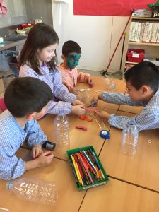 Només vam necessitar una ampolla de plàstic, dues palletes, dos globus, un guant i una mica de plastilina i cinta adhesiva.