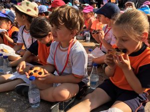 Els alumnes de P4 de l’escola, la classe de la Menta i la de l’Espígol, hem assaborit la coca amb cireres mentre els gegants feien les seves danses al mig de la plaça.