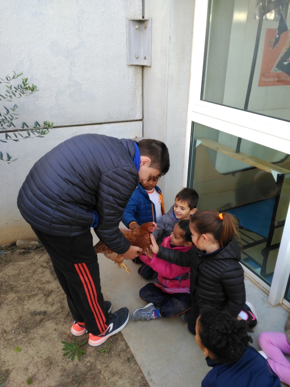 El dia 15 de novembre vam anar a recollir als nens de p5 a la seva classe per anar i a l’hort i quan hi ha vam arribar a l’hort els nens es van quedar mirant les gallines i després els i vam ensenyar un per un els ous que vam ficar aquell dia les gallines . Després els i vam fer seure a l’hort i com ells son tan llestos i estudien les gallines ens vam fer preguntes a nosaltres i com nosaltres sabem tant de les gallines doncs li vam contestar les preguntes i després el Jesús o el Alex van agafar una gallina i va passar un a un a que els nens la toquen i vam queda que els de p5 triarien nom a les gallines i que aniríem a la seva classe a fer les votacions . a i que va contesta les preguntes van ser el jesús i el Alex i el que ban parlar mes perquè el Izan va contestar 4 i jo 1 i no vaig contestar casi res a si que no vaig parlar casi res