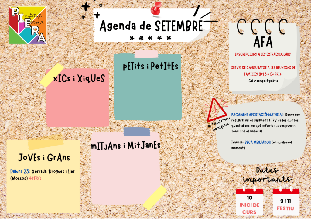 Agenda d’activitats del mes de setembre de 2024 Adrià Galimany Palau25/09/24 Aquestes són les activitats que tenim previstes a l’Institut Escola Piera per a aquest mes de setembre!