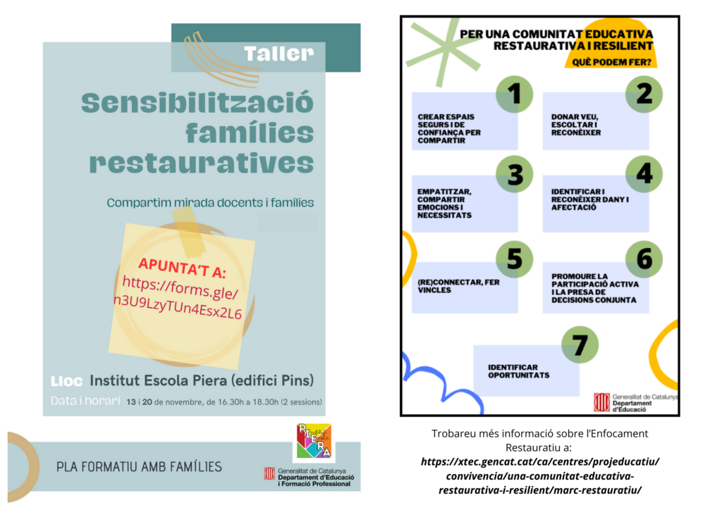 És per això que fem una crida a famílies, claustre i personal del centre a participar d’aquest taller que consta de dues sessions els dies 13 i 20 de novembre de 16.30h a 18.30h.