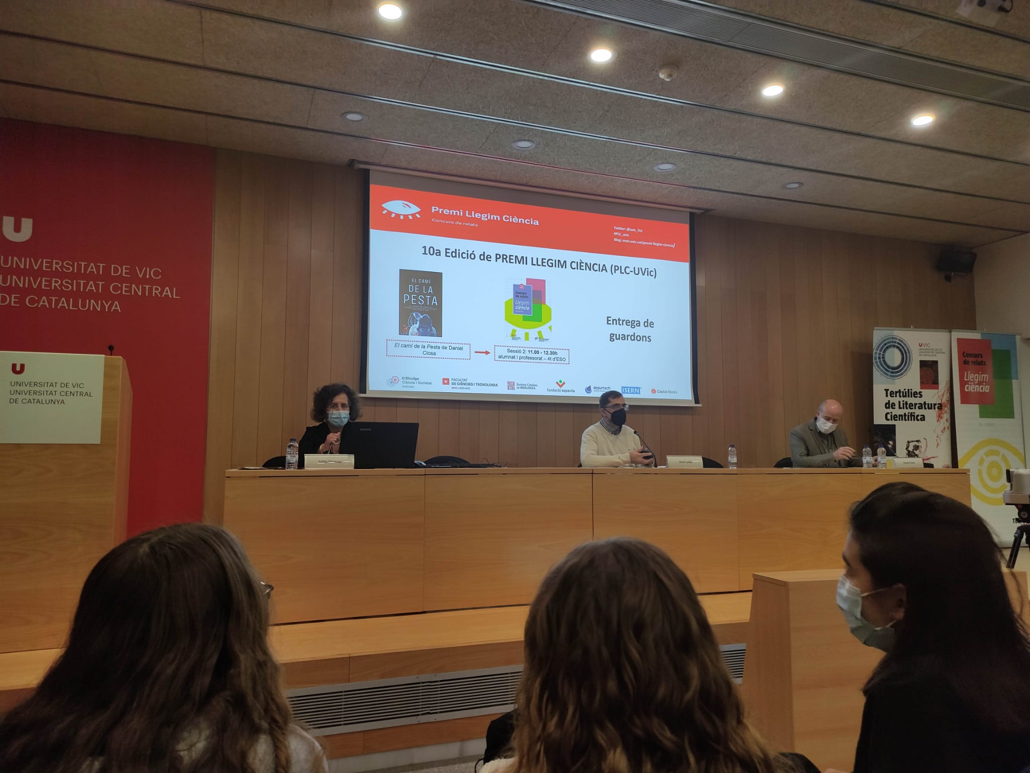 El passat dimecres dia 23 de febrer la Júlia Linde, de 4t d’ESO, va poder assistir juntament amb els seus pares i una de les seves professores a l’acte de lliurament de premis del concurs Llegim ciència que organitza la Universitat de Vic, Universitat Central de Catalunya. La Júlia va obtenir un accèssit pel seu final alternatiu de la novel·la El camí de la pesta del Daniel Closa, doctor en biologia, investigador del CSIC i escriptor. Allà vam tenir el plaer de conèixer i d’escoltar a l’autor, que li va signar el llibre a la Júlia.