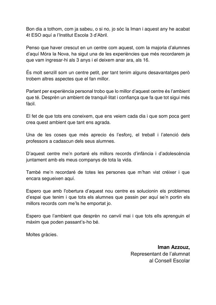 Aquesta dosis d’energia positiva que hem rebut en el dia d’avui amb el comunicat que es dona el tret de sortida a la construcció del nou edifici que acollirà alumnat i professorar de l’Institut Escola 3 d’Abril , encoratjarà encara més a tot l’equipa aconseguir noves fites que segurament seran un referent arreu de les nostres comarques.