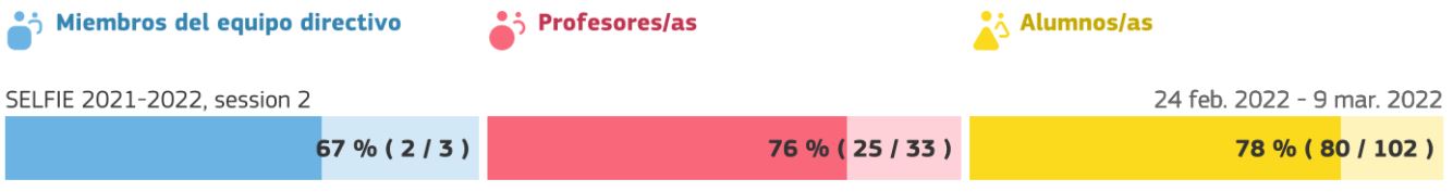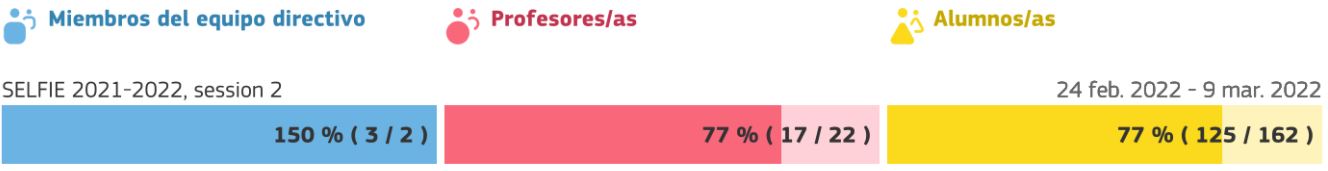 Aquesta eina SELFIE ha estat creada per la Comissió Europea d’Educació que permet a partir d’un qüestionari valoratiu amb preguntes diferenciades per a l’equip directiu, professorat i alumnat avaluar l’evolució de la integració de la tecnologia de l’Institut Escola. Cada final d’any es repeteix el procés d’avaluació per mesurar l’evolució de la integració de les TIC al centre i la seva maduresa digital. A continuació, es pot visualitzar la participació a l’etapa de primària i a l’etapa de secundària, respectivament.