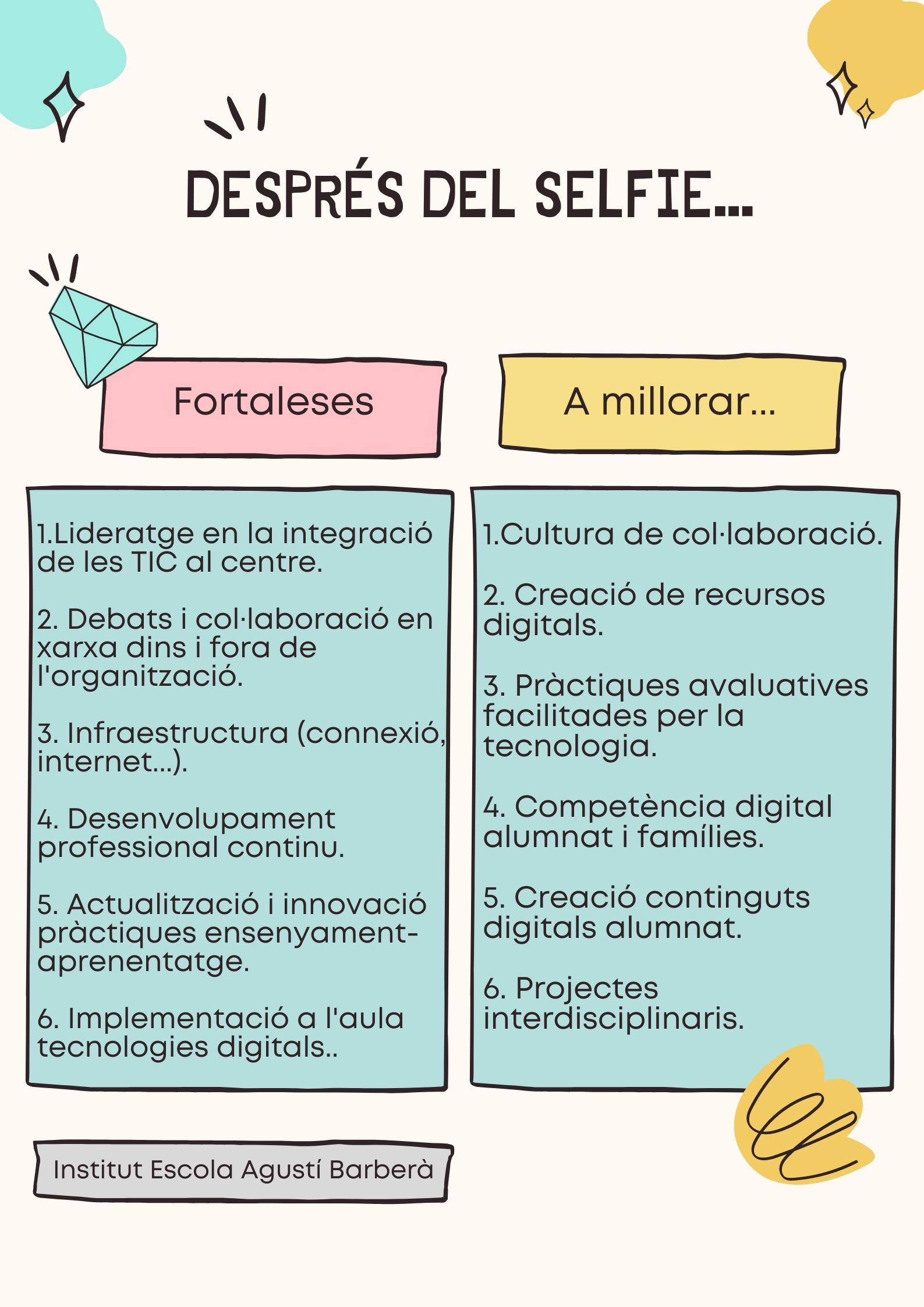 A partir de l’anàlisi de les dades d’aquesta eina, es van detectar els següents punts forts (fortaleses) i els punts a millorar dels aspectes següents:
