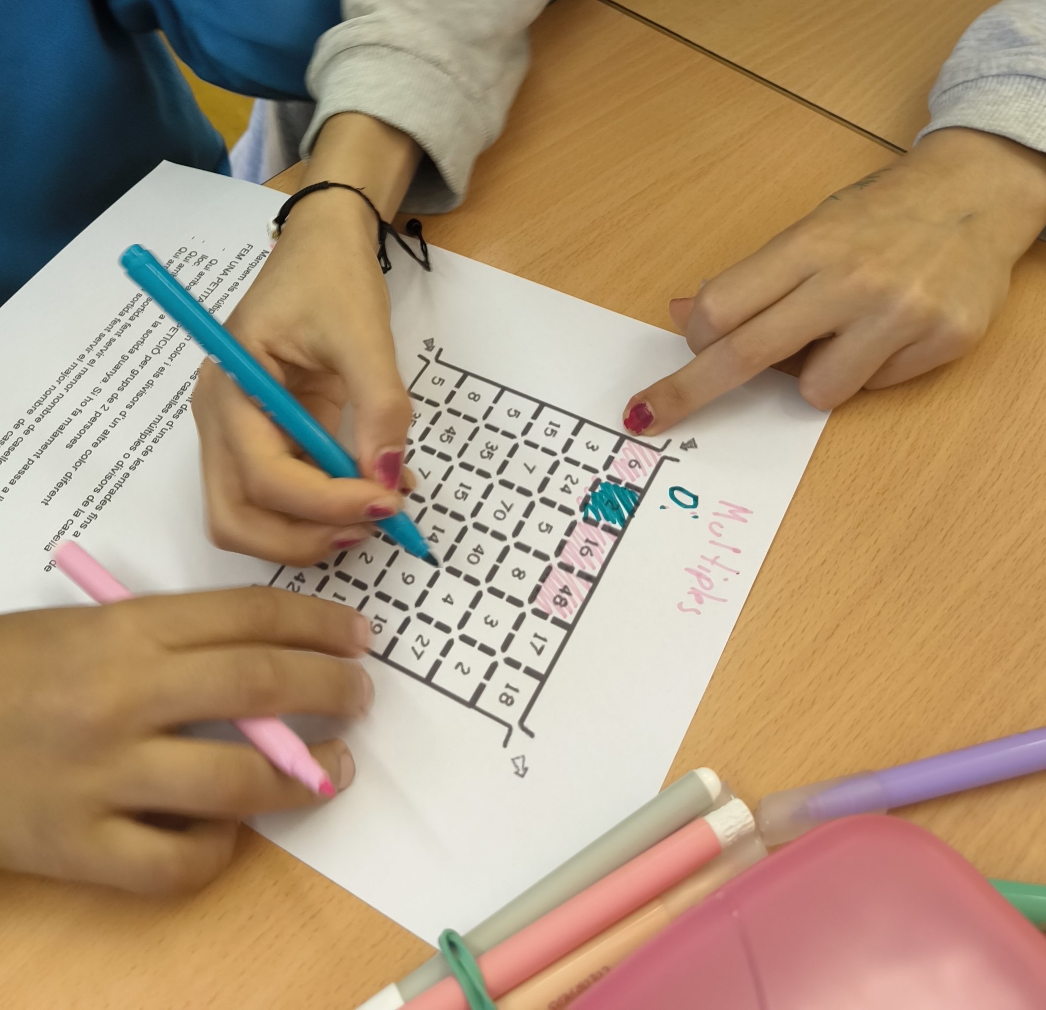 Fem una petita competició en grups de 2 alumnes per fomentar el treball en equip. El joc es tracta de trobar el camí per travessar el laberint amb el menor temps, passant únicament per caselles de múltiples i divisors. Pintem les caselles del laberint de dos colors, fem servir un color pels múltiples i un altre color pels divisors. L’objectiu és reforçar el treball en equip, i els conceptes de múltiple i divisor d’un nombre. També ens serveix per repassar les taules de multiplicar, multiplicacions i divisions.