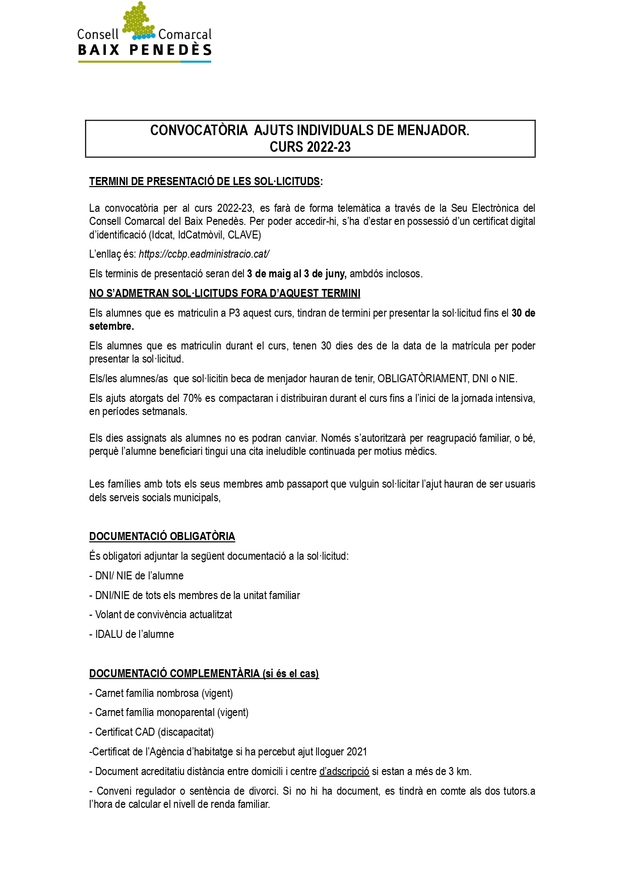 Us presentem la nota informativa sobre la convocatòria per les ajuts individuals de menjador, pel curs 2022-2023.