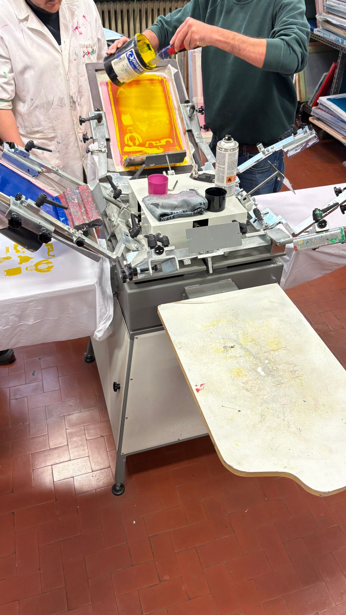 At the end of the day, we were able to observe the Screen Printing class with Professor Di Stefano. They showed us the technique used to make the prints. In this case, the students had made a design (their caricatures) on a t-shirt, had prepared the frame with the screen printing screen and applied the paint using the squeegee. They carried out the procedure several times, once for each color, and finally let the product dry. It was a very interesting practical class.