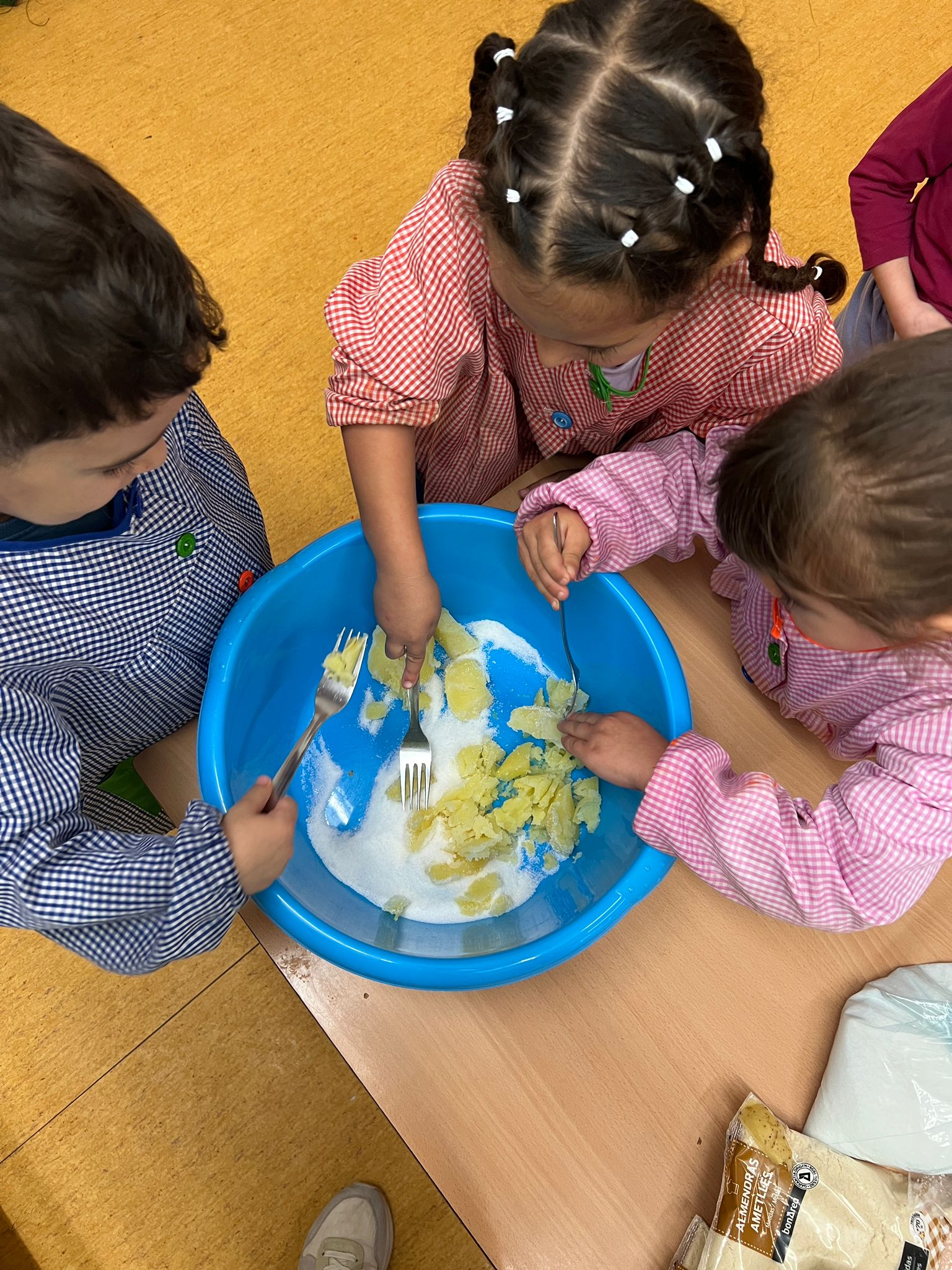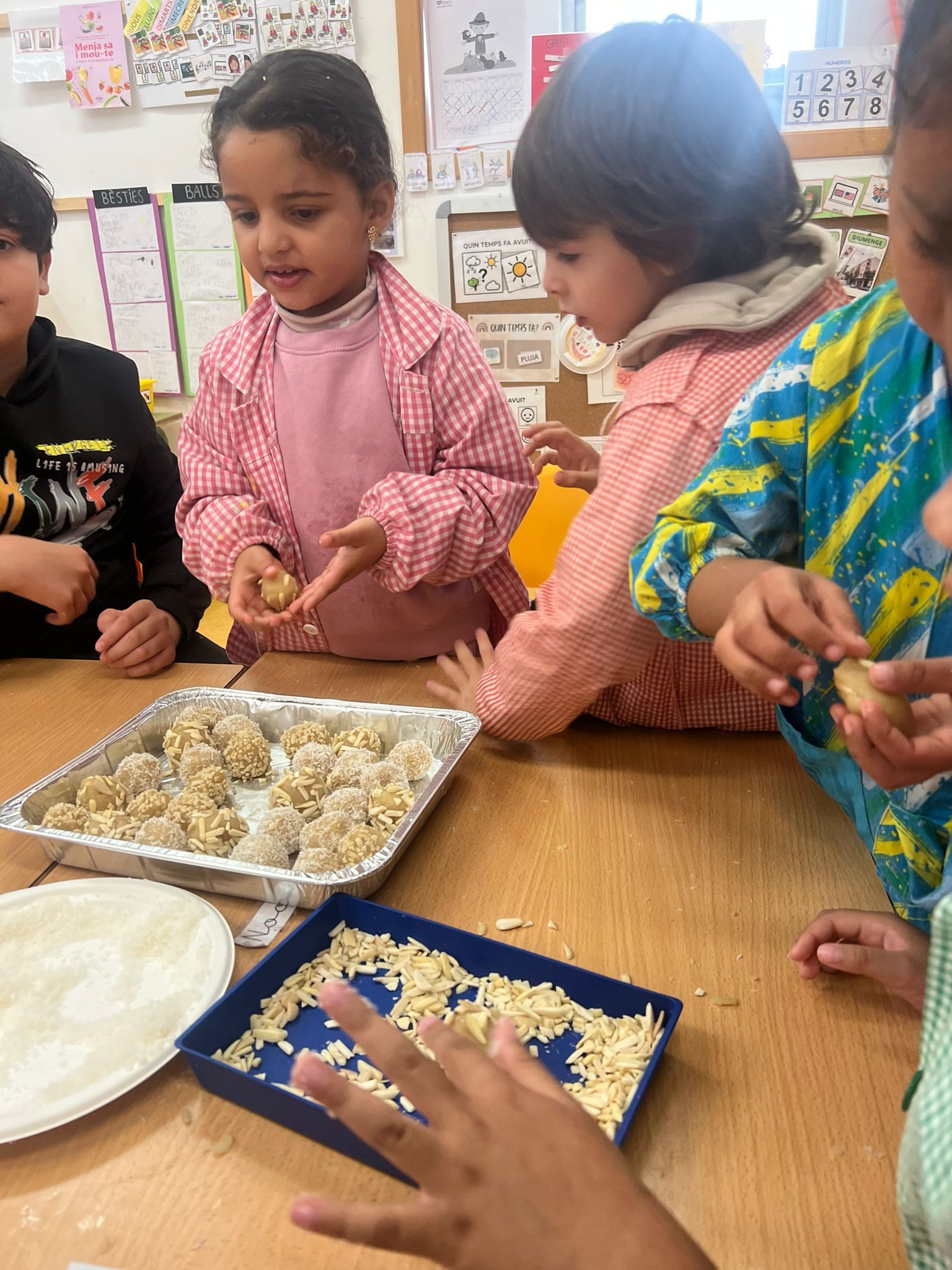 Avui els nens i nenes d’infantil hem fet panellets amb l’ajuda dels companys i companyes de 1r d’ESO. Primer de tot, hem fet la massa amb patata, sucre i ametlla. Quan l’hem tingut ben amassada, ha tocat fer les boletes i decorar-les amb coco i ametlles. Segur que estaran boníssims.