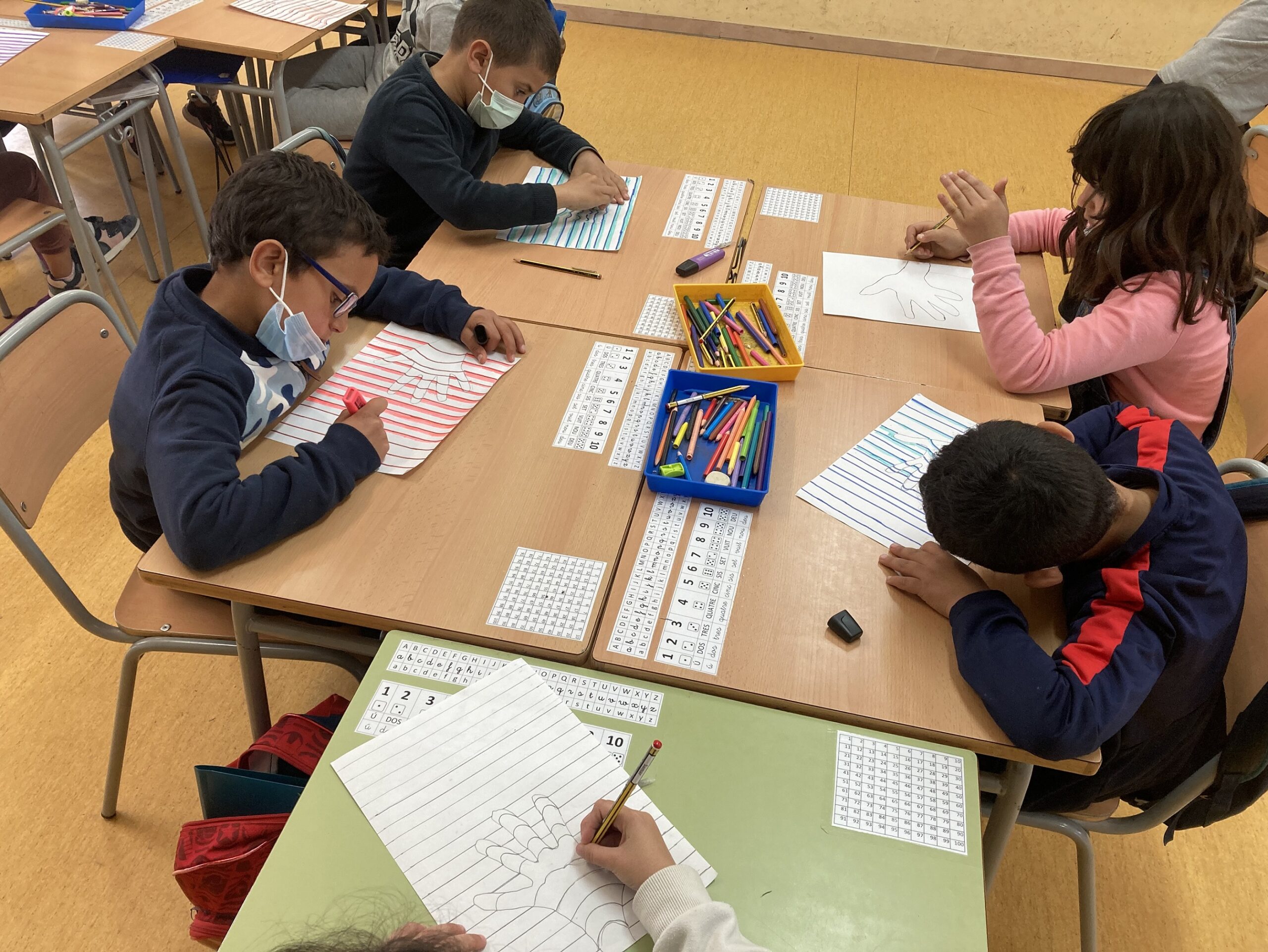Quin efecte més divertit, una mà que sembla que surti del paper. Aquest curs, hem treballat diferents tècniques per pintar dibuixos, des dels colors de sempre, les aquarel·les fins a tècniques que no coneixíem, com pintar amb trames. L’última tècnica que hem treballat, ens ha agradat molt i ens ho hem passat d’allò més bé fent-la. Hem dibuixat la nostra mà, després hem fet unes línies amb unes petites corbes, ho hem resseguit amb diferents retoladors gruixuts i finalment, el truc final, afegir unes ombres amb el llapis. La mà sembla que s’aixequi del paper. Quin efecte més divertit.