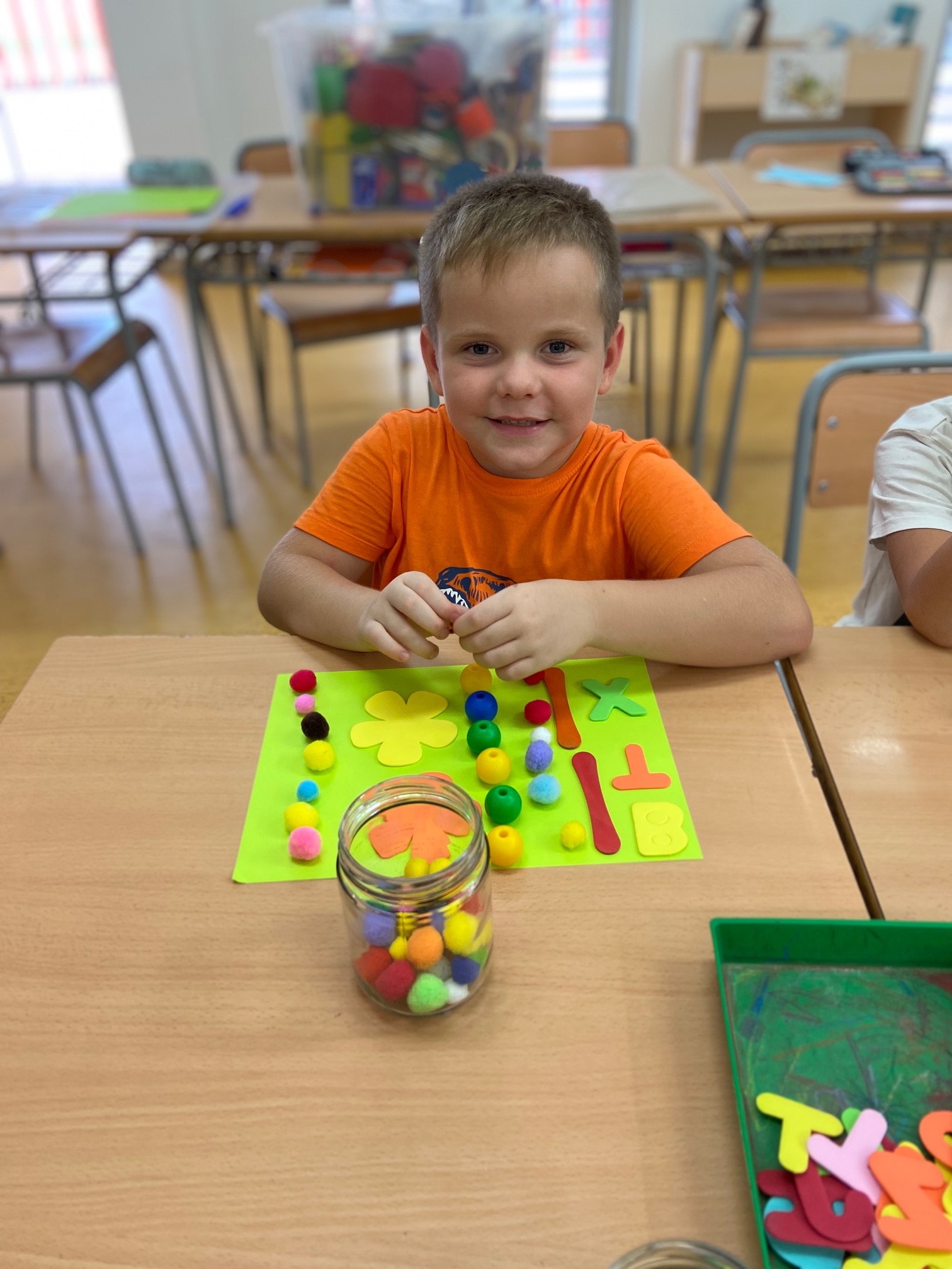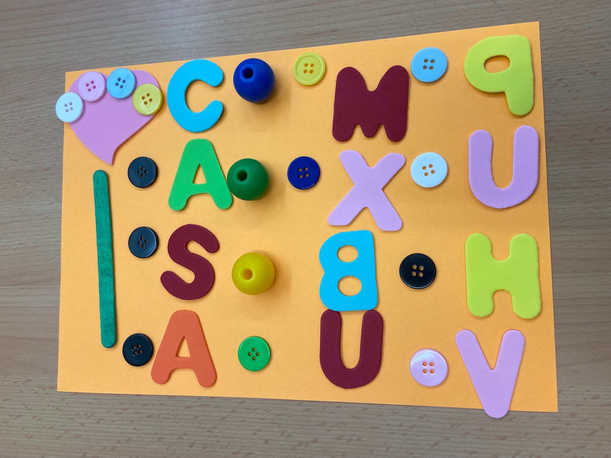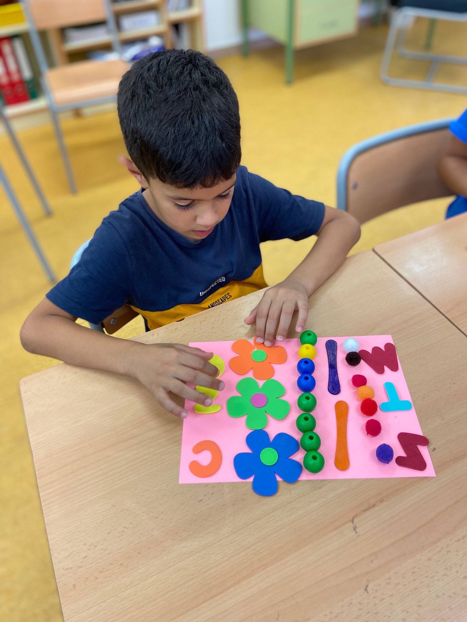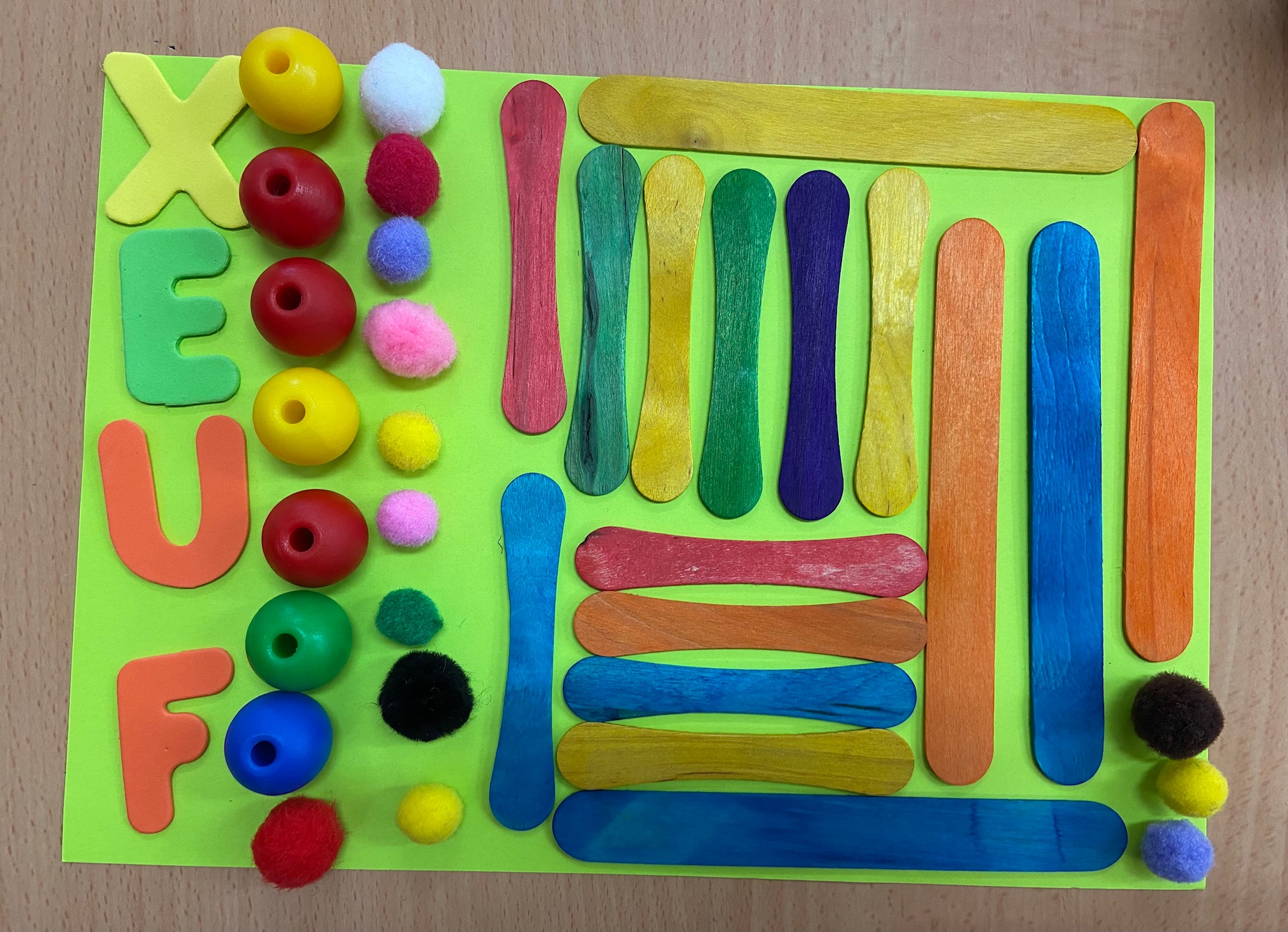 Hem posat al seu abast diferents materials com: pinces d’estendre la roba, botons, lletres, boles d’enfilar, pals de fusta de colors, boletes de roba… perquè experimentin i desenvolupin amb llibertat els fonaments del llenguatge plàstic: l’art de crear. Mireu quines composicions més boniques!