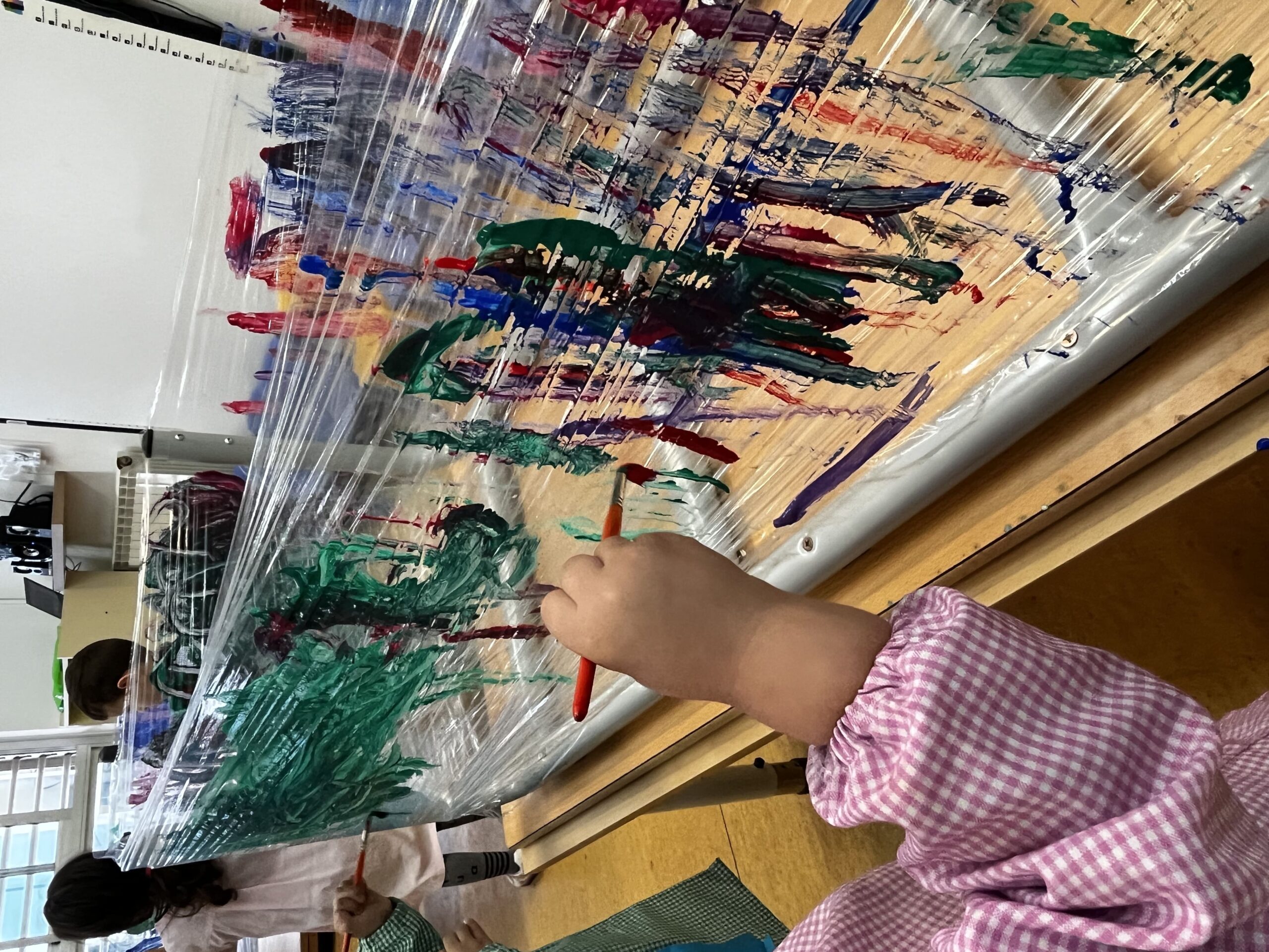 Una de les últimes sessions de Plàstica ha consistit a fer pintura vertical sobre paper de plàstic transparent. En entrar a l’aula l’alumnat es va trobar les taules del revés embolicades de paper film. A continuació, van poder expressar-se lliurement amb la pintura i els pinzells que vam deixar al seu abast.