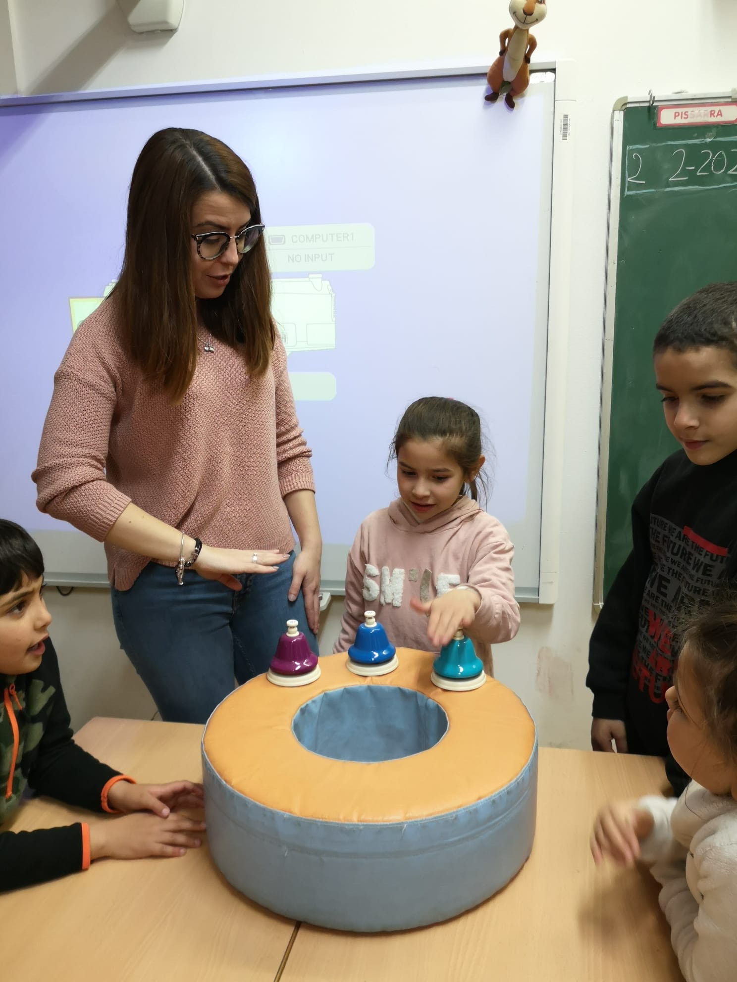 En primer lloc, hem imaginat que el nostre cos era el pentagrama per tal de situar cada nota amb les nostres mans a l’alçada corresponent, mentre cantàvem el seu so. Posteriorment, hem jugat a memoritzar i reproduir diferents patrons melòdics interpretats per la mestra, per tal d’associar cada nota amb el color de la campana corresponent. Finalment, hem jugat a endevinar i reproduir diferents patrons melòdics interpretats per la mestra d’amagat.