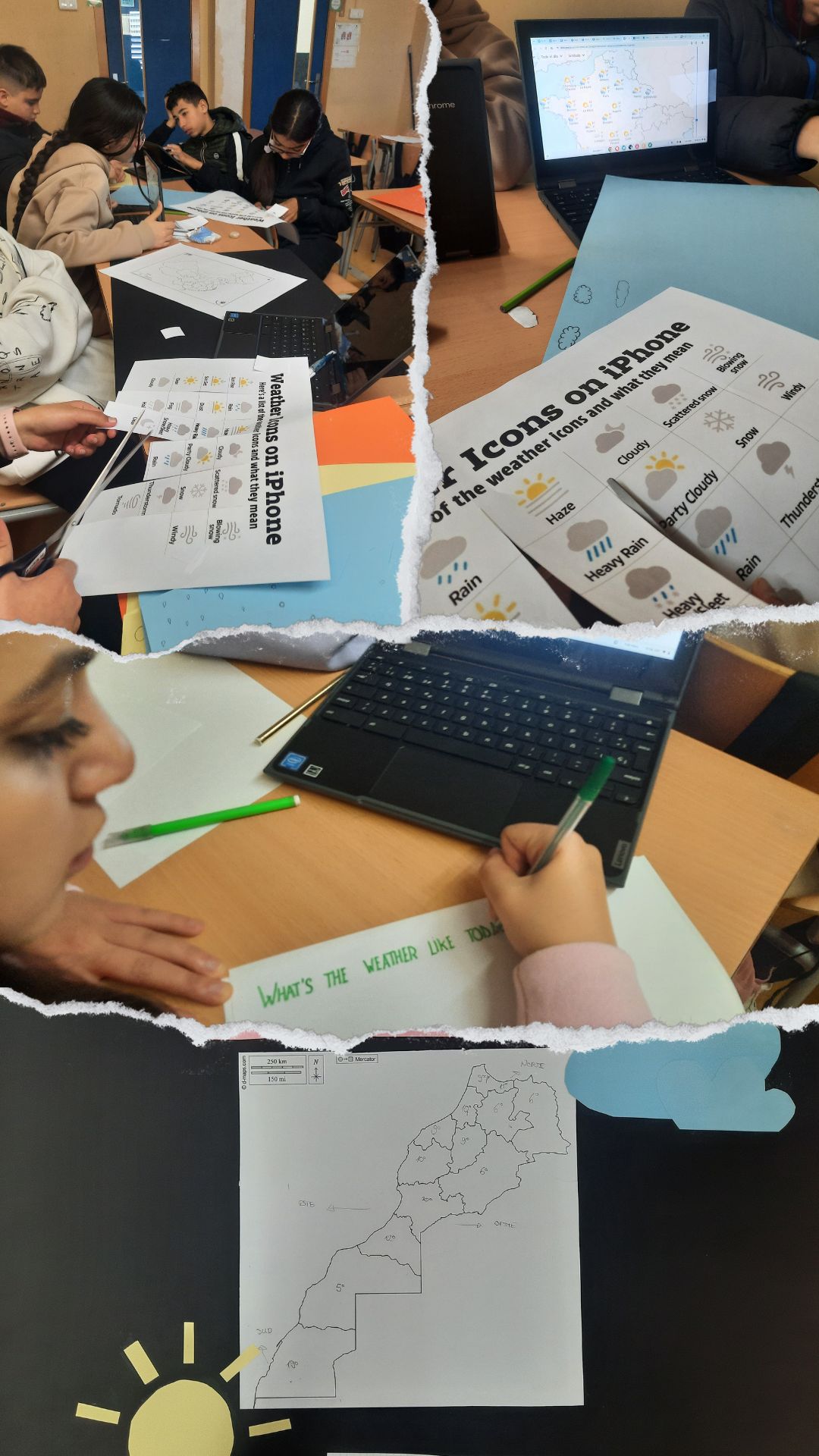 In 3rd ESO we are learning tot talk about the weather. Our students are working in collaborative groups to create a weather forecast. Each group has been assigned a different country such as Morocco, China, Spain or Pakistan. The final product is a poster with the map of the country, the weather icons and the text with the forecast. Once they have finished the poster, they will become weather reporters and they will present their results.