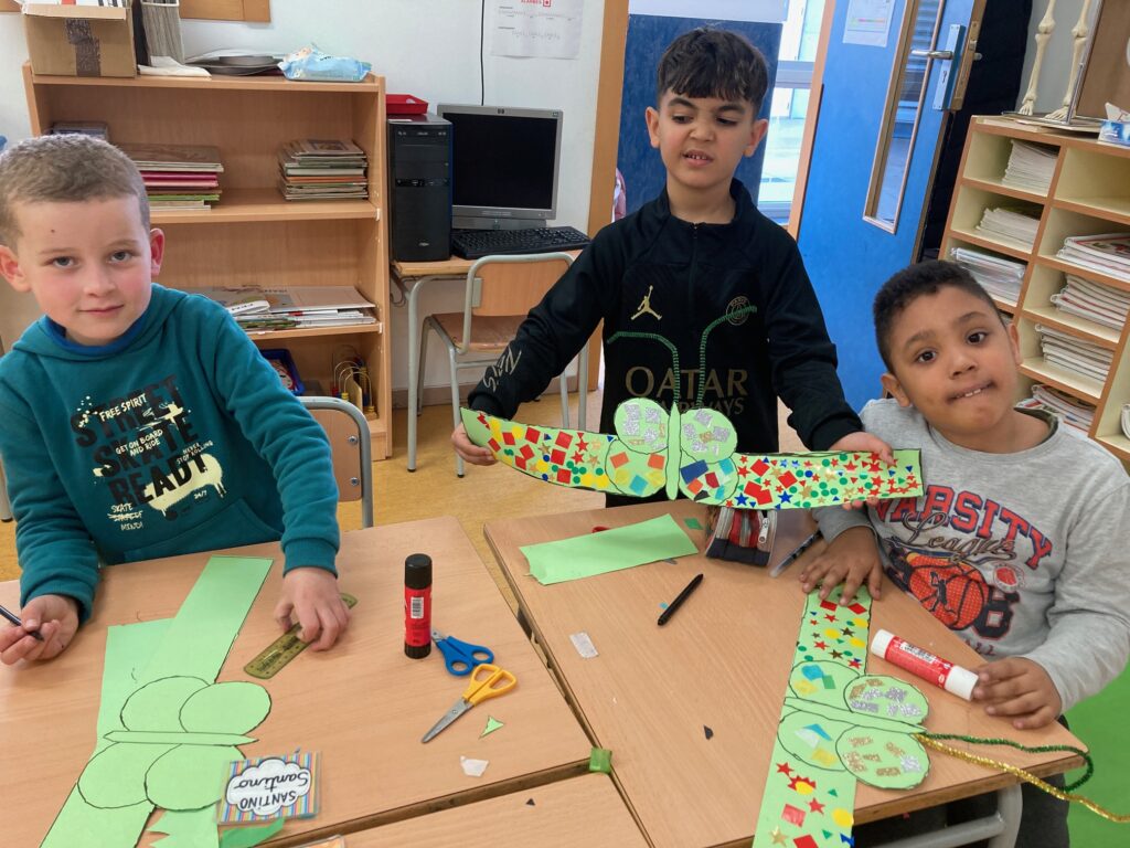 Els alumnes de primer, ens estem preparant: les nostres disfresses estem engalanant! Decorem les papallones amb gomets i purpurina, papers