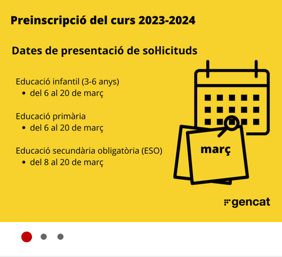 02/03/23El proper dilluns dia 6 de març i fins el dia 20 de març ja podeu formalitzar la preinscripció per als estudis d’Infantil (2n Cicle) i Primària al nostre Centre. Es fa de forma telemàtica i ho podeu fer a partir d’aquest enllaç.