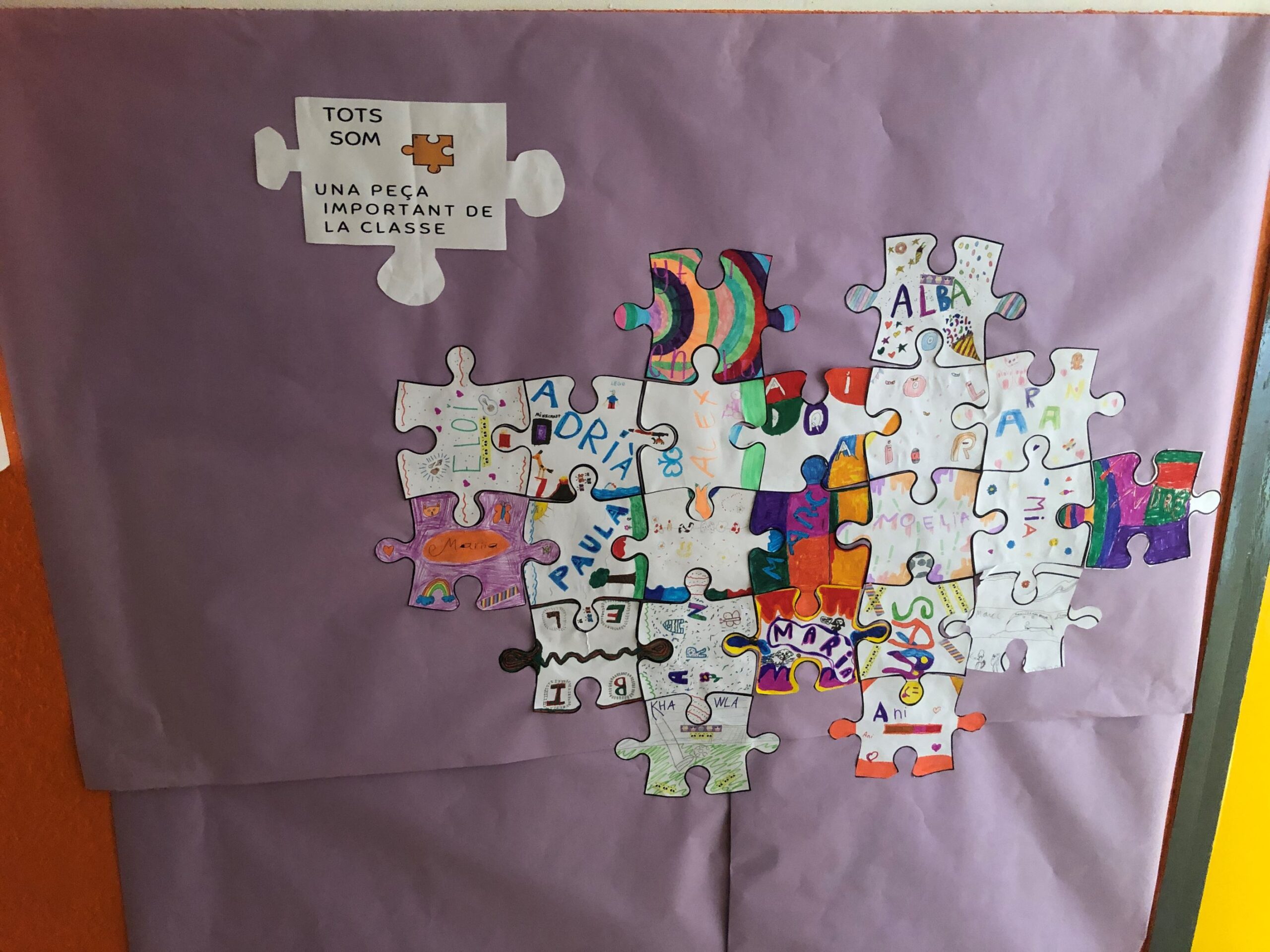 Després de fer algunes dinàmiques i alguns altres jocs sobre aquest tema, hem acabat confeccionant entre tots el trencaclosques de la classe de 4t. Aquest trencaclosques està format per cadascuna de les peces que individualment cada alumn@ ha creat i decorat. La unió de totes les peces de la classe ha acabat formant el trencaclosques de 4t. A partir d’aquí hem pogut parlar, debatre i compartir la idea que s’expressa al mural final que diu que “TOTS SOM UNA PEÇA IMPORTANT DE LA CLASSE”.