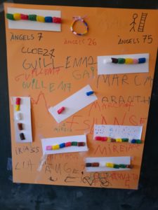Ens hem mesurat amb un metre de colors (i sense números). Però alguns de nosaltres hem necessitat unes peces de fusta més curtes per arribar a la nostra alçada! I és que menjant tanta fruita cada cop som més alts!!! Després hem mesurat la llargada de la classe, d’un banc i d’una taula: