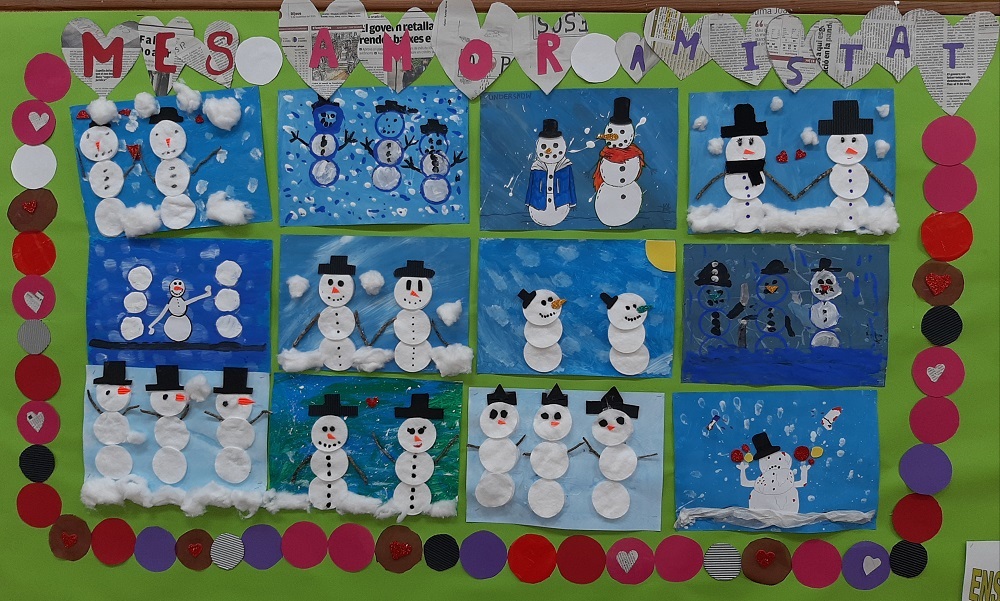 Vam començar fent un projecte d’hivern en que consistia en fer un o mes ninots de neu en un full que havíem decorat prèviament amb colors freds.