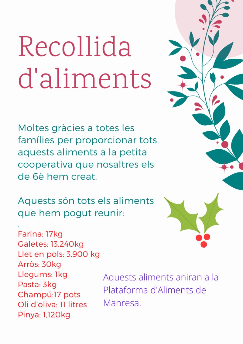 Aquesta acció s’emmarca en un projecte realitzat per l’alumnat de 6è i els aliments es destinaran a la Plataforma d’Aliments de Manresa.