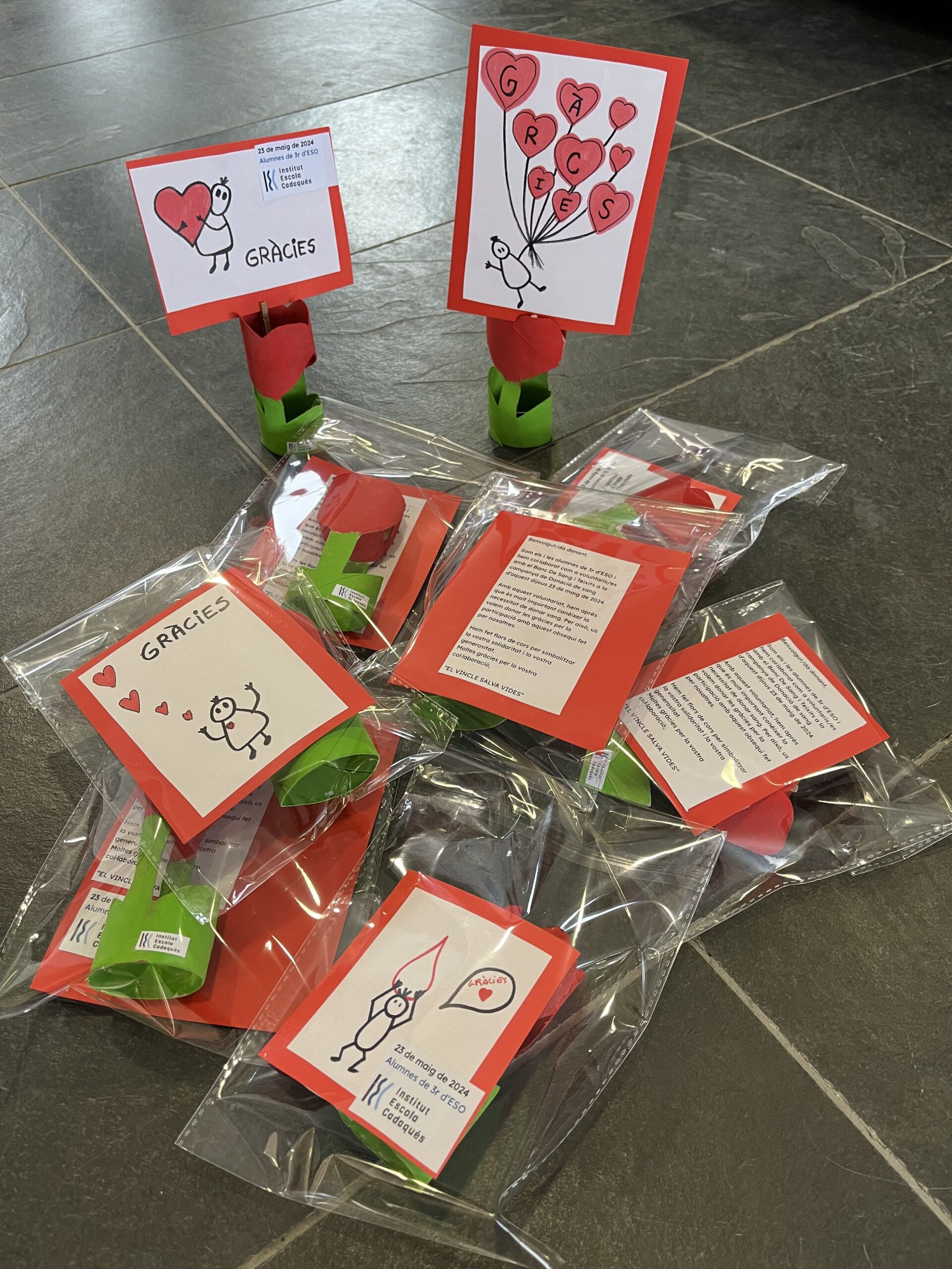 Com a mostra d’agraïment, els i les alumnes van oferir a tots els donants un regal fet per ells mateixos, una flor amb forma de cor que serveix de portafotos i una targeta divertida amb un text d’agraïment.