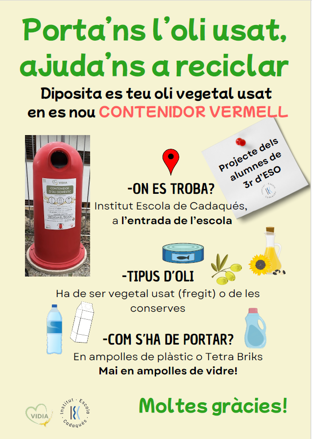 Ens fa molta il·lusió compartir amb vosaltres una iniciativa ecològica en la qual els nostres alumnes de 3r d’ESO han estat treballant dins la matèria d’Emprenedoria. En col·laboració amb l’associació VIDIA, hem establert un punt de recollida d’oli vegetal usat al nostre centre per contribuir a la protecció del medi ambient.