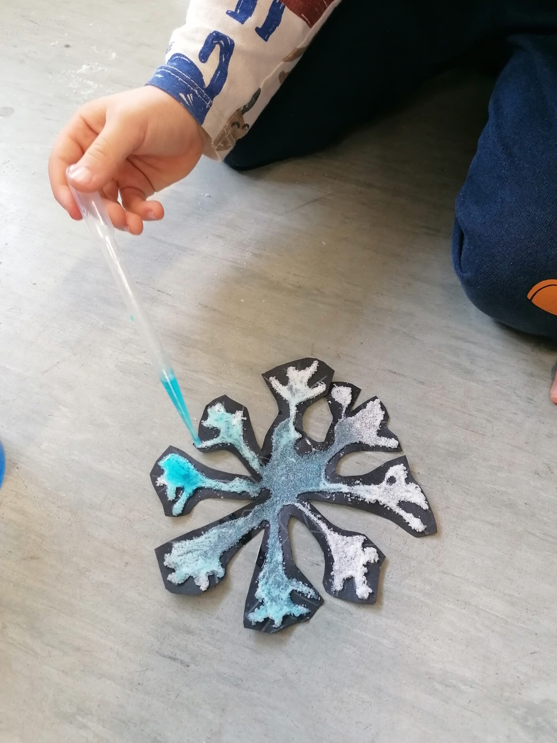 Per fer el floc de neu, dibuixeu la forma del floc de neu amb cola blanca i afegiu una mica de sal per sobre. Una vegada estigui seca, deixeu caure unes gotes d’aigua tenyida i observeu quin és el resultat.