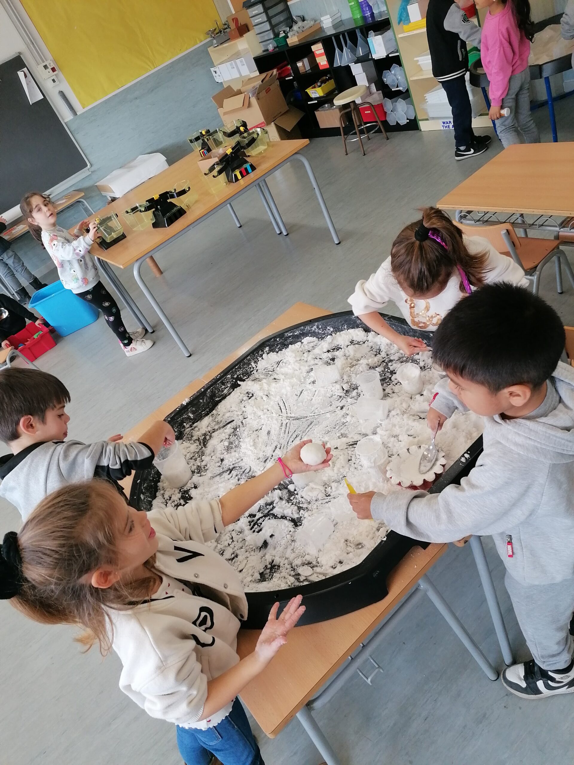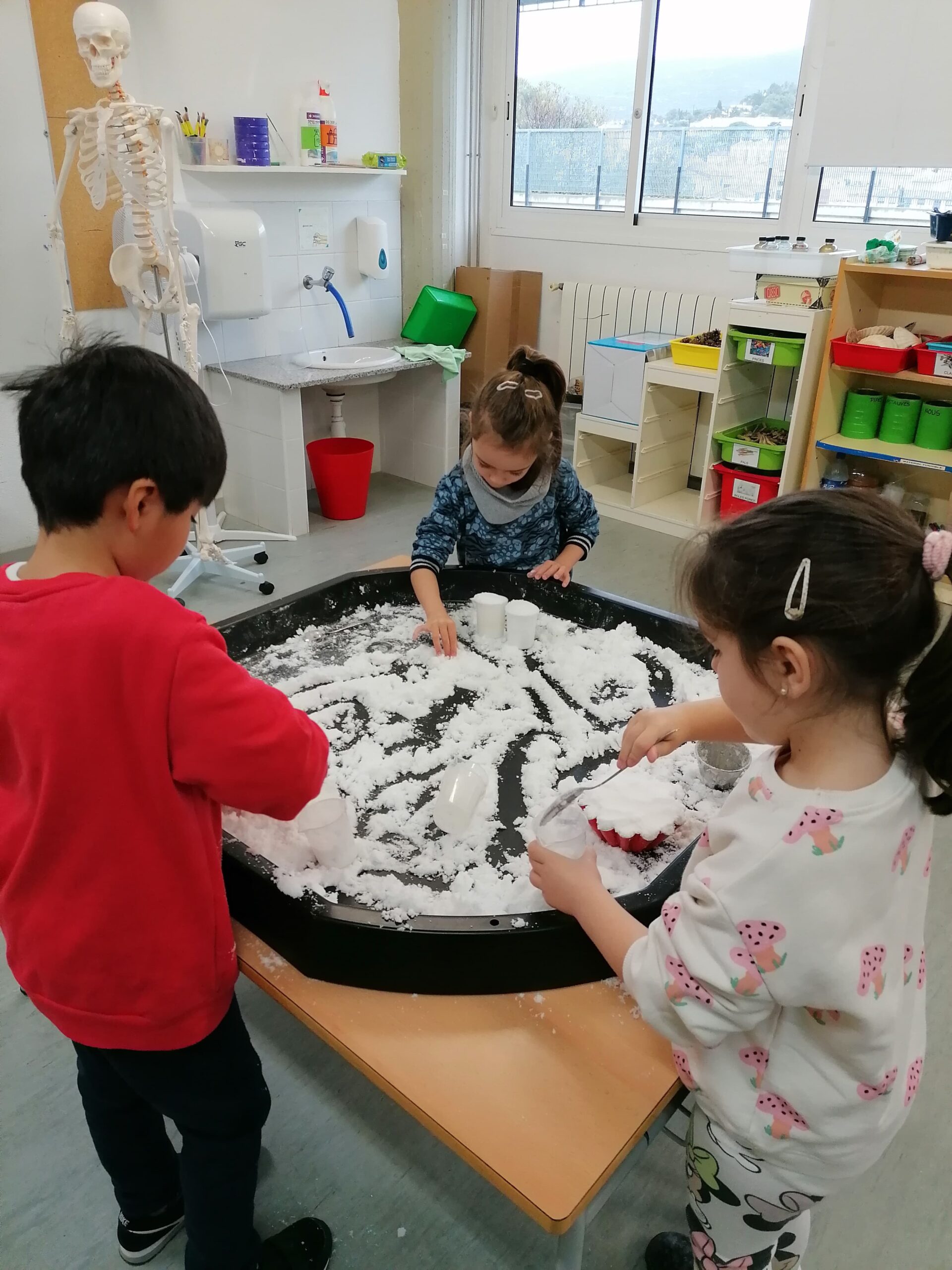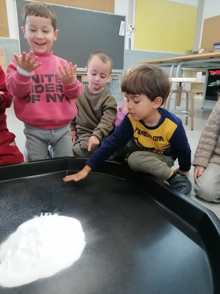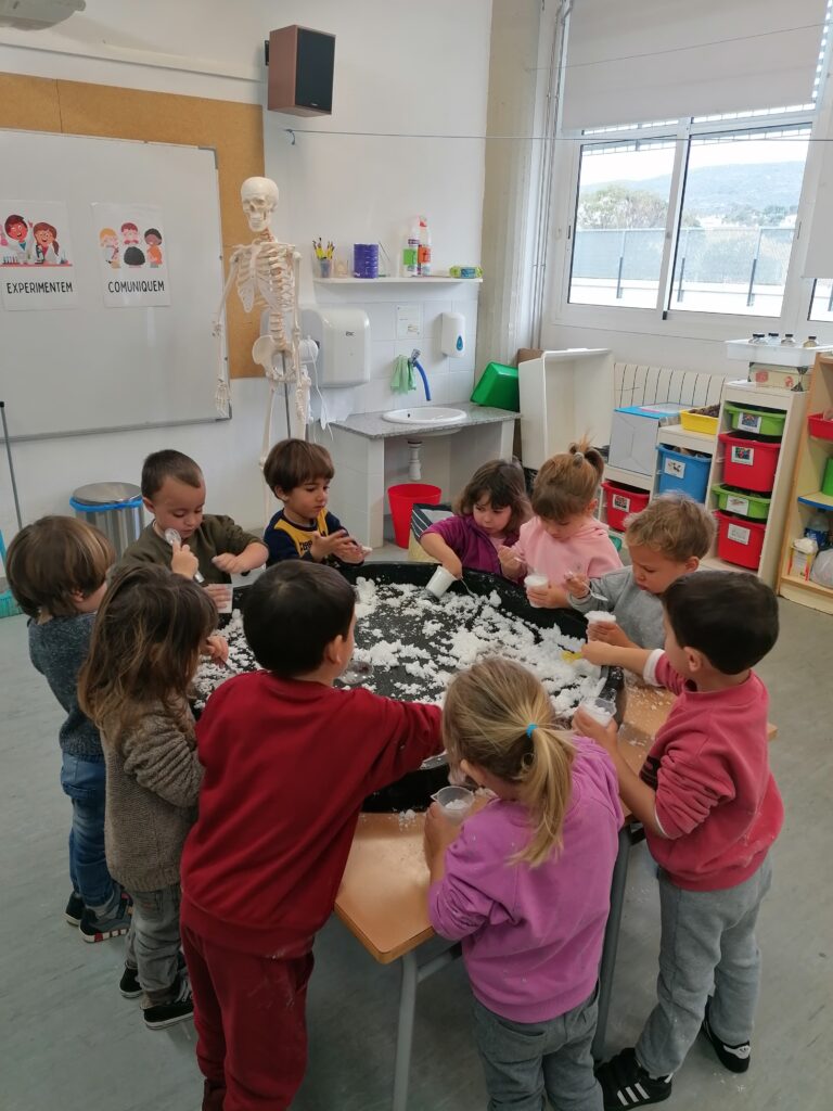 La neu és un element que dona moltes possibilitats de joc i així ho hem comprovat a l’aula d’experimentació. Durant aquestes setmanes, una de les propostes que els i les alumnes d’I3, I4 i I5 han trobat a l’aula ha estat aquesta safata d’experimentació amb neu artificial, amb la qual han pogut comprovar textures i propietats d’aquesta neu tan especial en funció de la quantitat d’aigua afegida. Per una altra banda, els alumnes d’I4 van elaborar un petit experiment per crear un floc de neu que els va servir per decorar la porta de l’aula. Us deixem el funcionament de les dues propostes per si us animeu a portar-les a terme a casa!