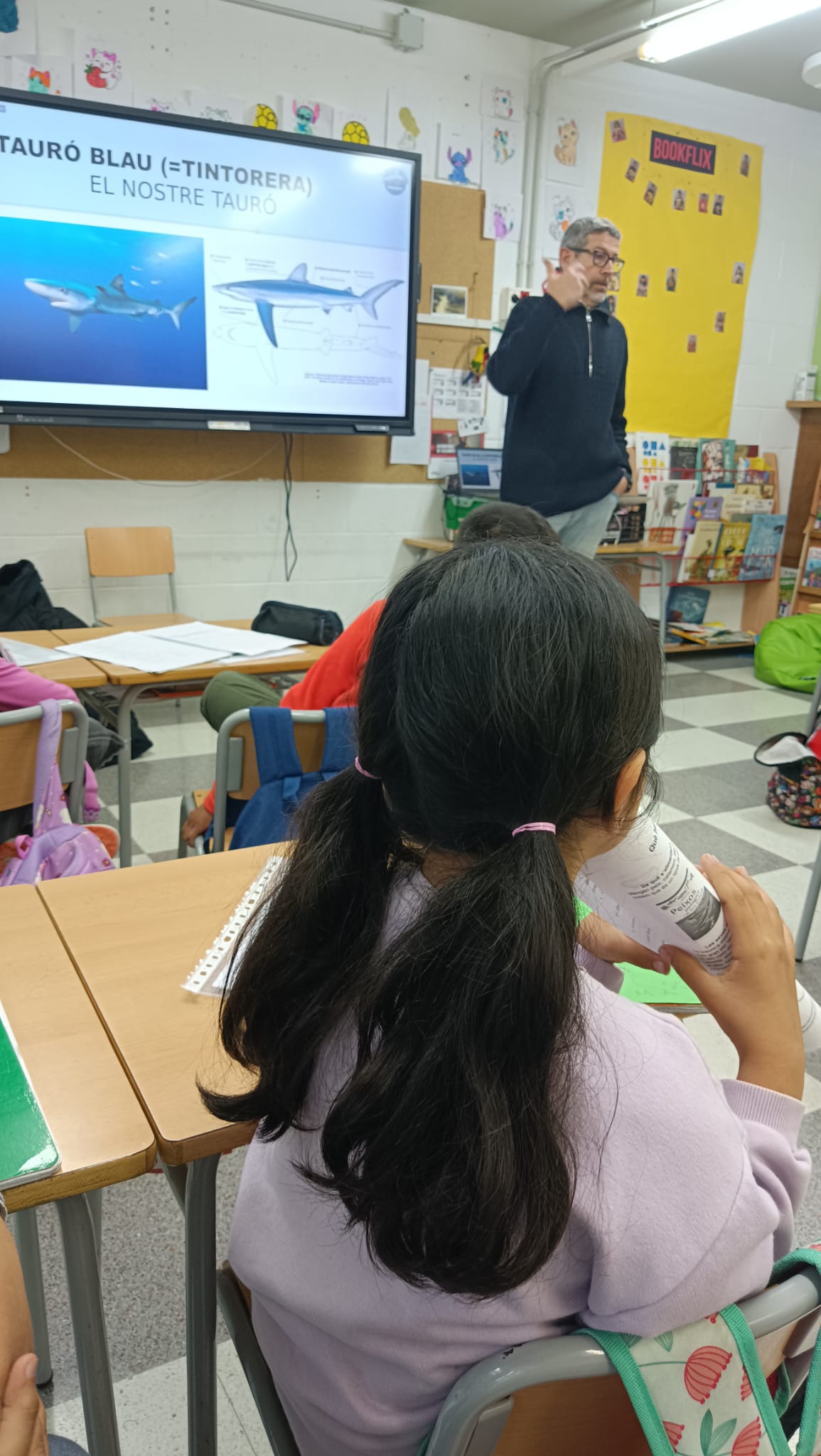 En Jordi, un gran coneixedor des taurons, ens va fer una xerrada sobre els tipus de taurons i les tintoreres en particular. L’Esther, que fa uns anys va fer de voluntària tenint cura dels dofins mulars, ens va explicar moltes coses sobre aquests animals.