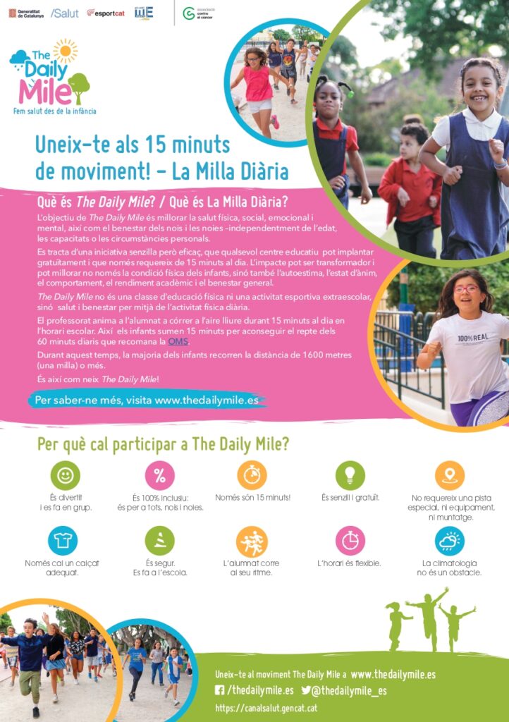 Des de l’Institut escola Caritat Serinyana us animem a participar en el projecte “The daily Mile” per millorar la vostra salut fÃsica, social, emocional i mental a través de 15 minuts d’activitat fÃsica al dia.