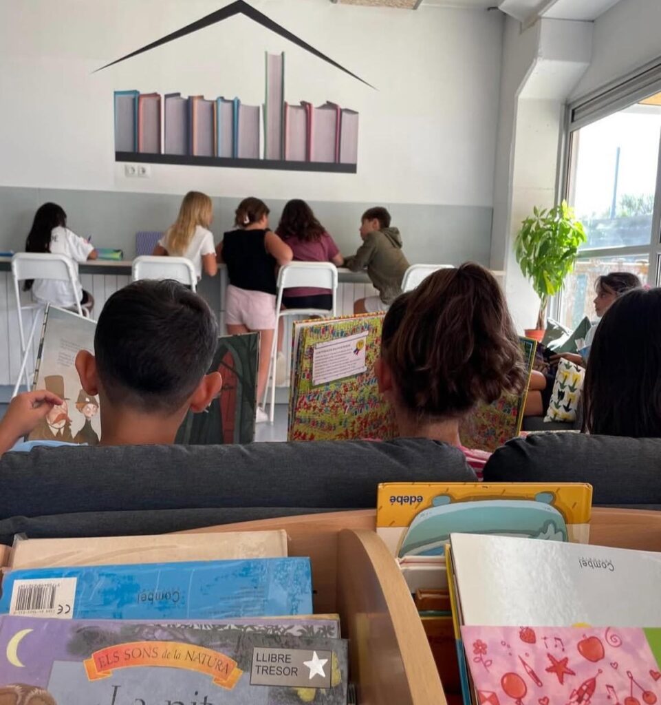 a la biblioteca de l’escola, amb espai per llegir, zona de treball i servei de préstec.
