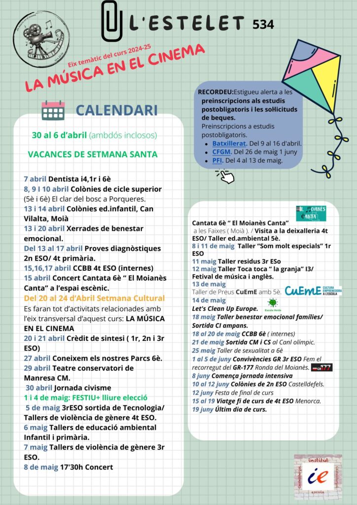 Us fem arribar l’Estelet, el full informatiu de l’Institut Escola Castellterçol, amb informacions dels mesos d’abril, maig i juny.