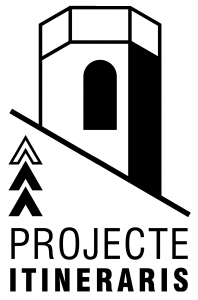 El logotip del projecte itineraris, en blanc i negre, té dos tipus de lletra: Allieron heavy per al text “projecte itineraris” i Raleway per al text “IE Castellterçol”.