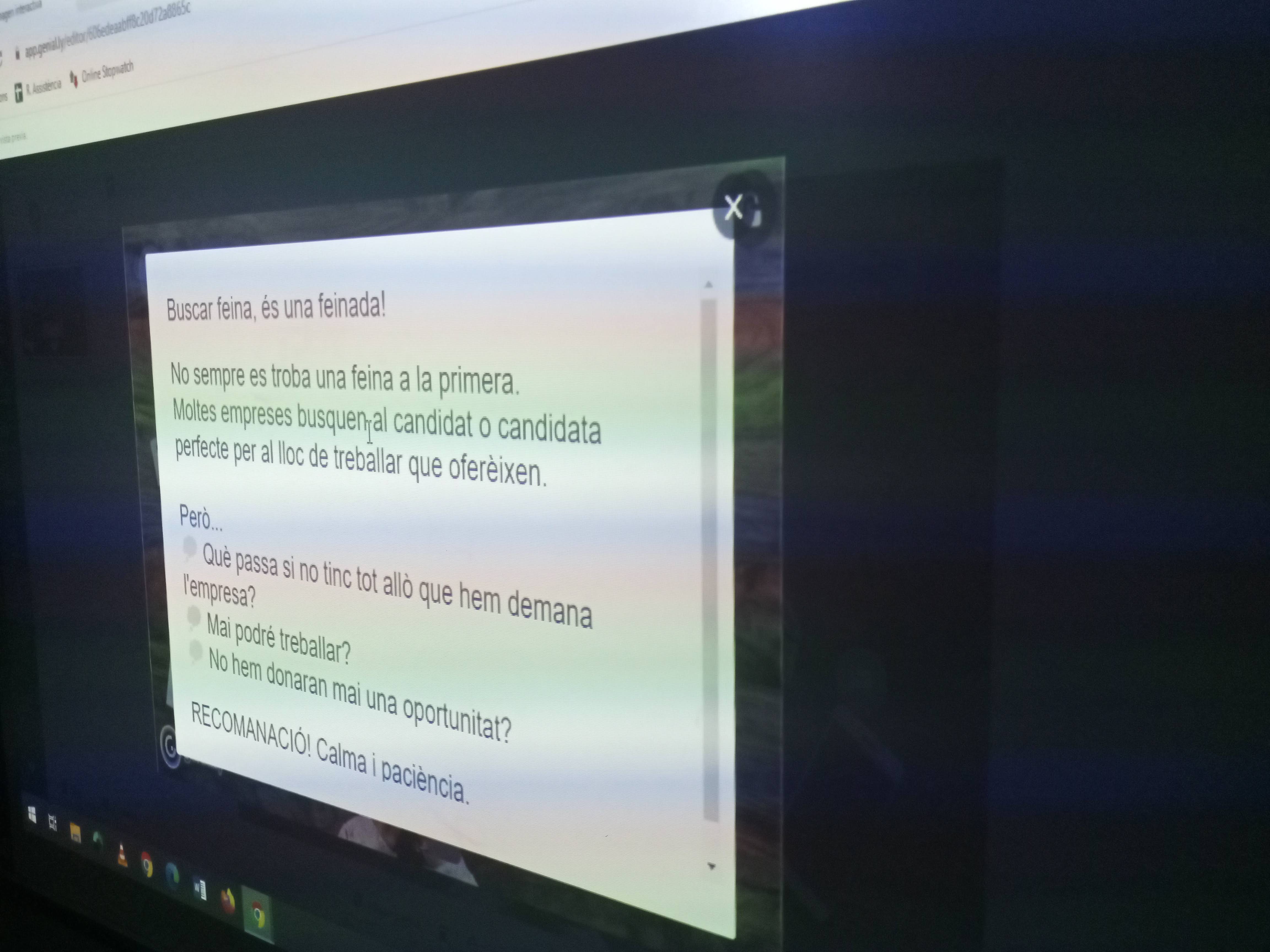 Ahir en va visitar la tècnica d’ocupació juvenil del Consell Comarcal del Moianès, la Vanesa Rubio, per explicar a l’alumnat de 4t d’ESO tot allò que necessiten saber per entrar dins del mercat laboral. Al llarg de la sessió va treballar diversos continguts com: el currículum, la carta de presentació, l’entrevista de feina, canals i recursos de cerca de feina, etc. IMPORTANT! va engrescar al nostre alumnat (els que ja tinguin 16 anys) a visitar-la al Consell Comarcal i així poder començar a buscar feina o, si més no, estar dins d’una borsa de treball.