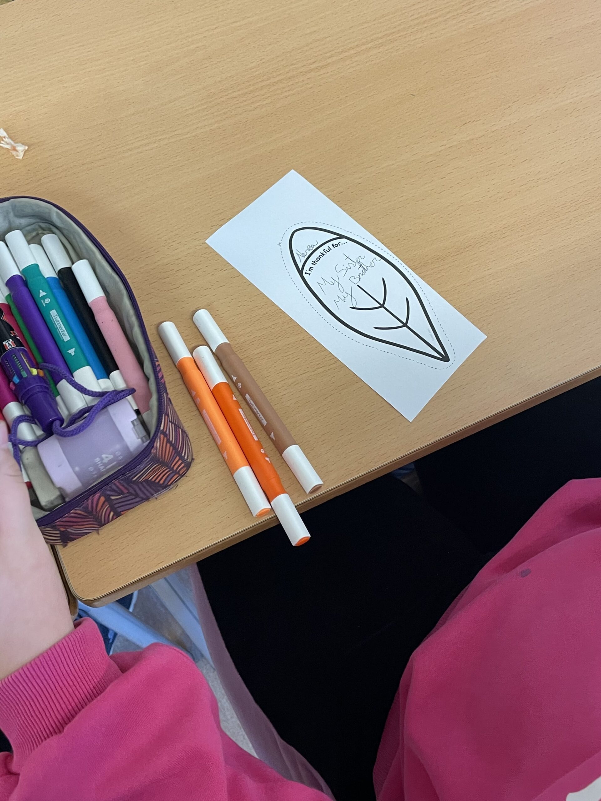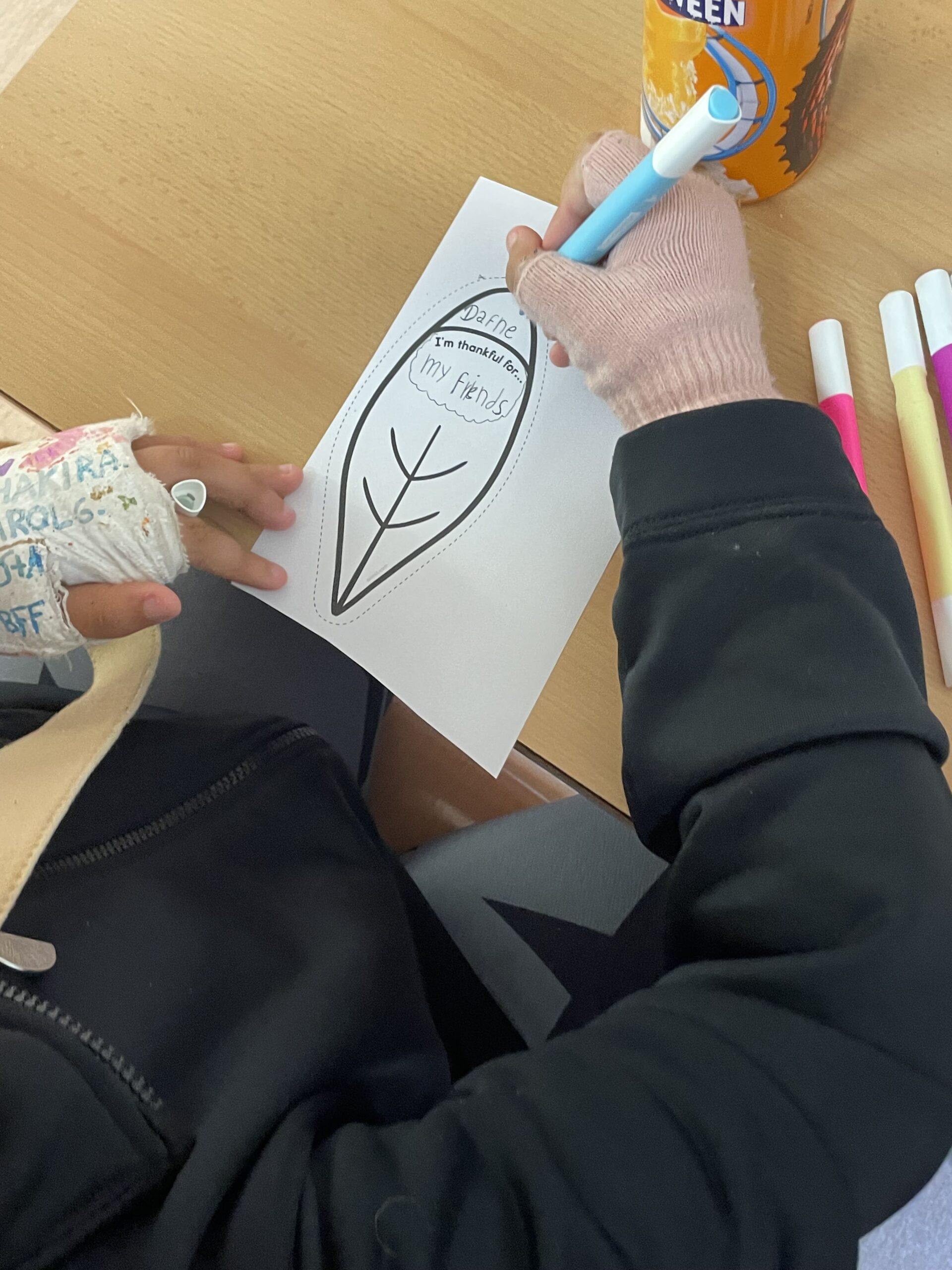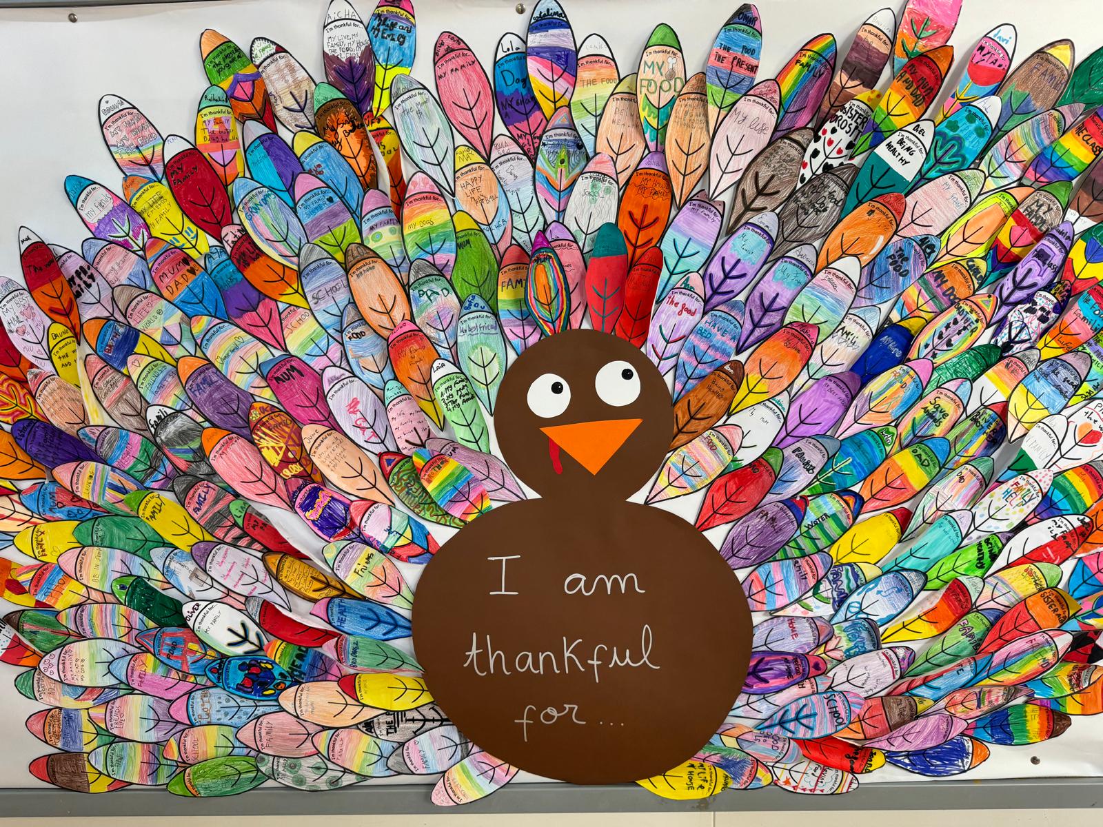 Tots els alumnes de primària han participat en la creació d’un gran gall dindi, on cada ploma representava un motiu d’agraïment. A les plomes han escrit paraules com família, vida, menjar, escola, entre altres. Aquest exercici no només ha reforçat el vocabulari en anglès, sinó que també ha posat en valor aspectes fonamentals del currículum educatiu, com l’empatia, el respecte i el treball en equip.
