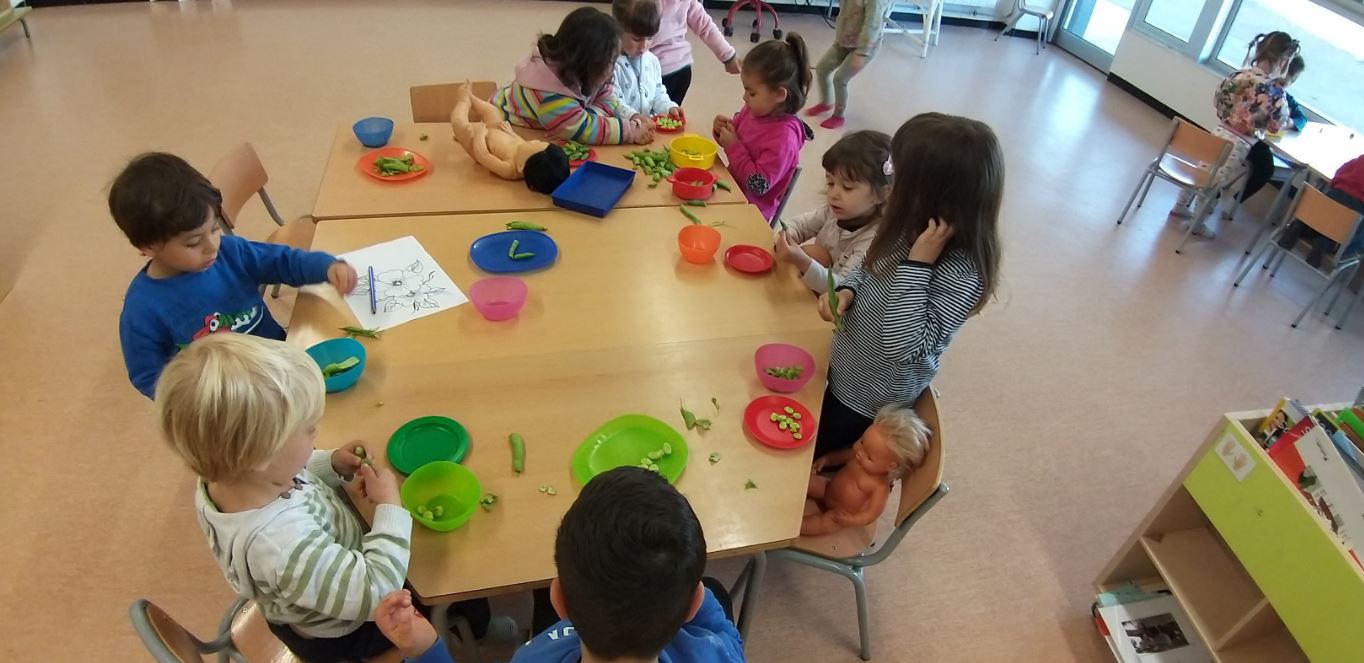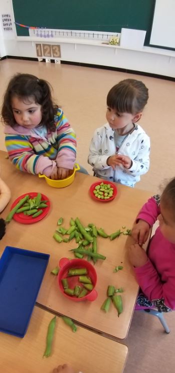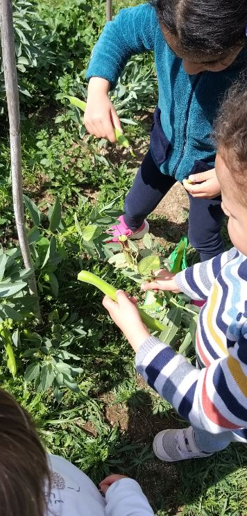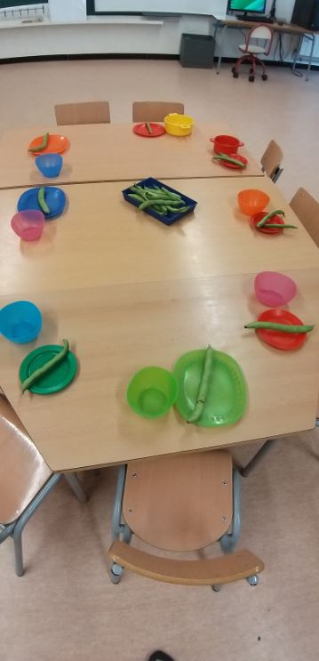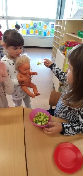 Després de la nostra collita ens vam emportar unes faves a casa per tastar-les amb la família i per poder explicar què havien vist i fet a l’hort. L’endemà a la classe vam treure les faves de la seva vaina ( un treball de motricitat fina molt complex) i les vam utilitzar per jugar amb la cuineta i les nines.