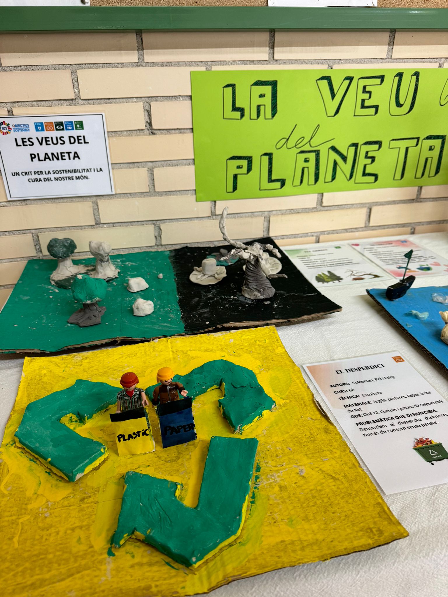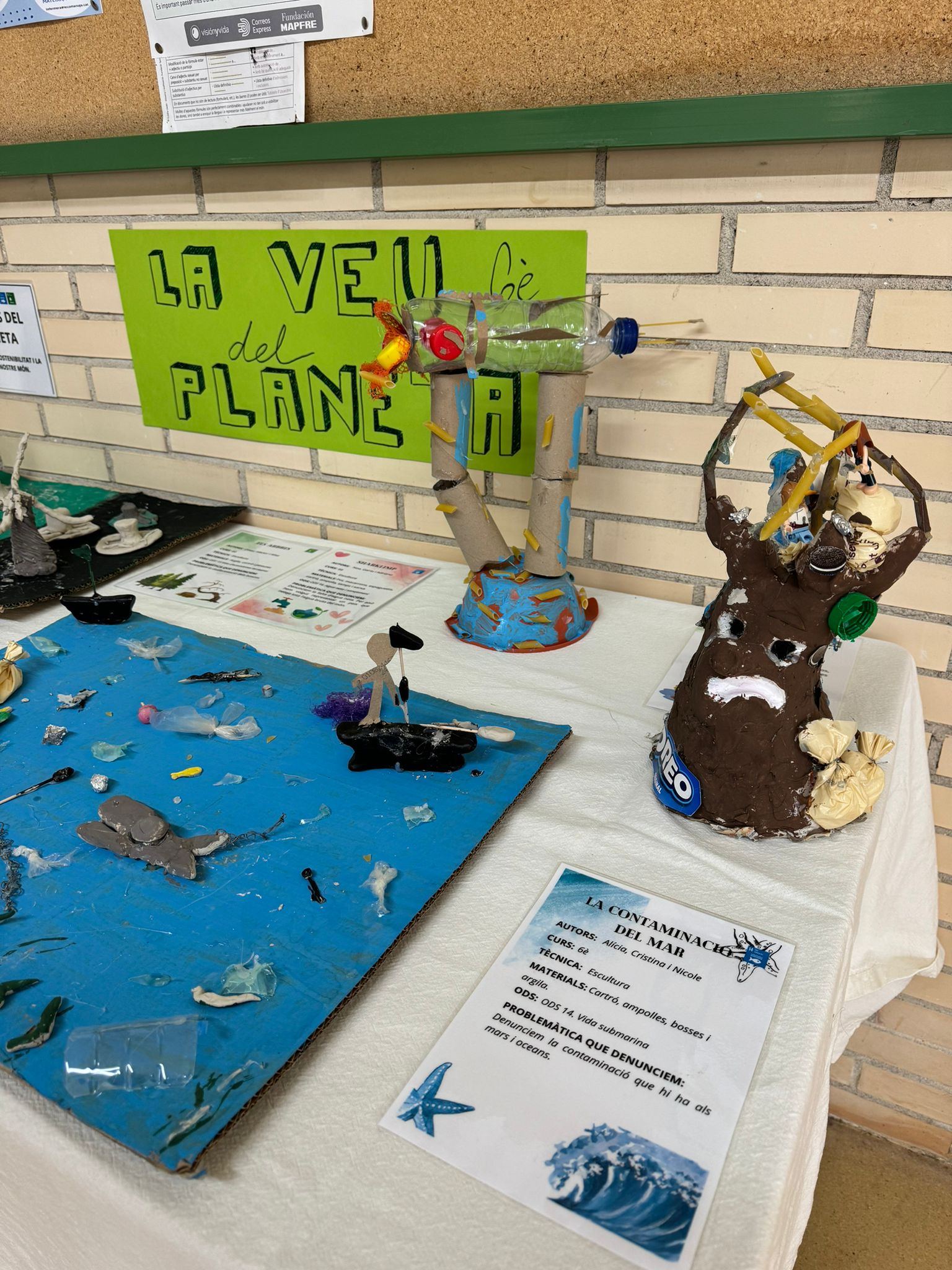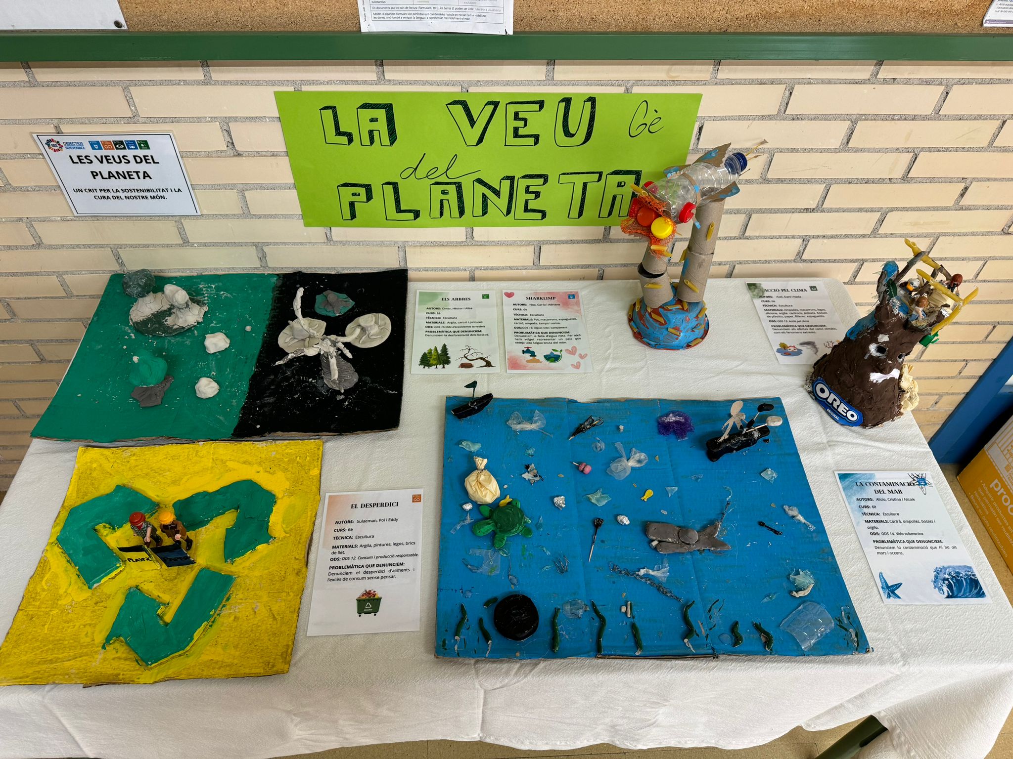 A la classe de reptes l’alumnat de 6è de primària ha representat diverses problemàtiques ambientals relacionades amb els ODS 6 (Aigua Neta i Sanejament), 12 (Producció i Consum Responsables), 13 (Acció pel Clima), 14 (Vida Submarina) i 15 (Vida Terrestre) a través de l’art.