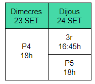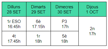 L’horari és de 14-16 hores a l’edifici verd i de14.10-16.10 a l’edifici blau.