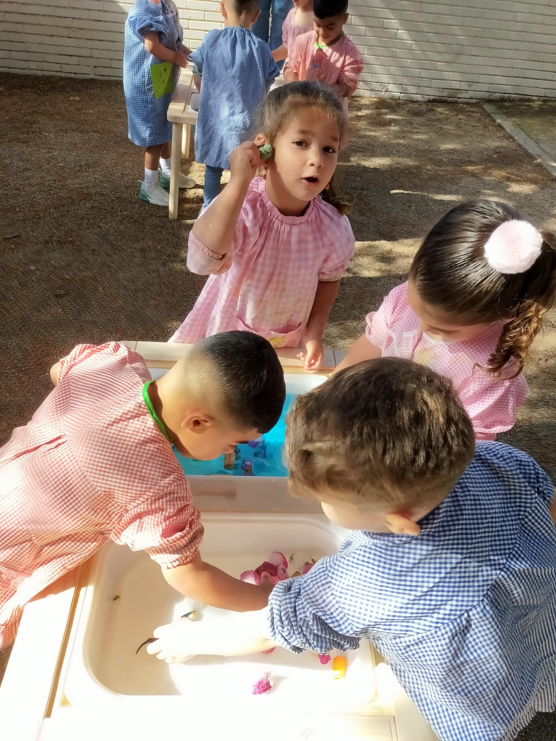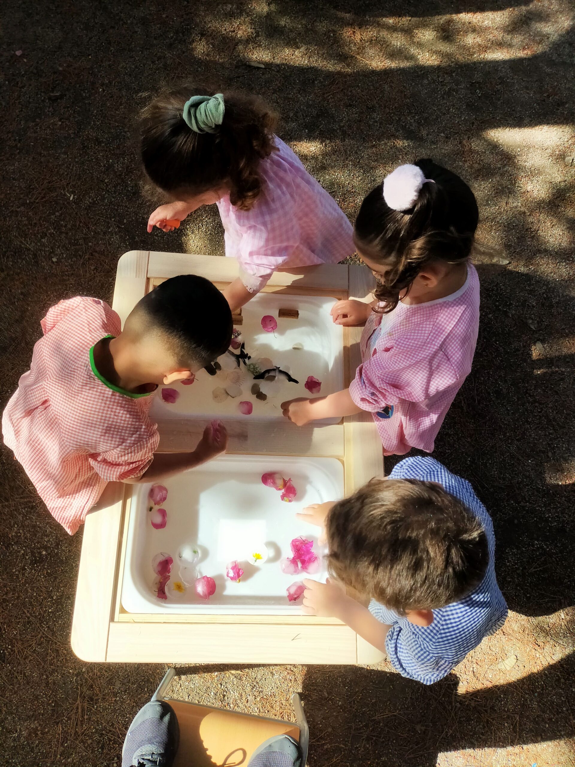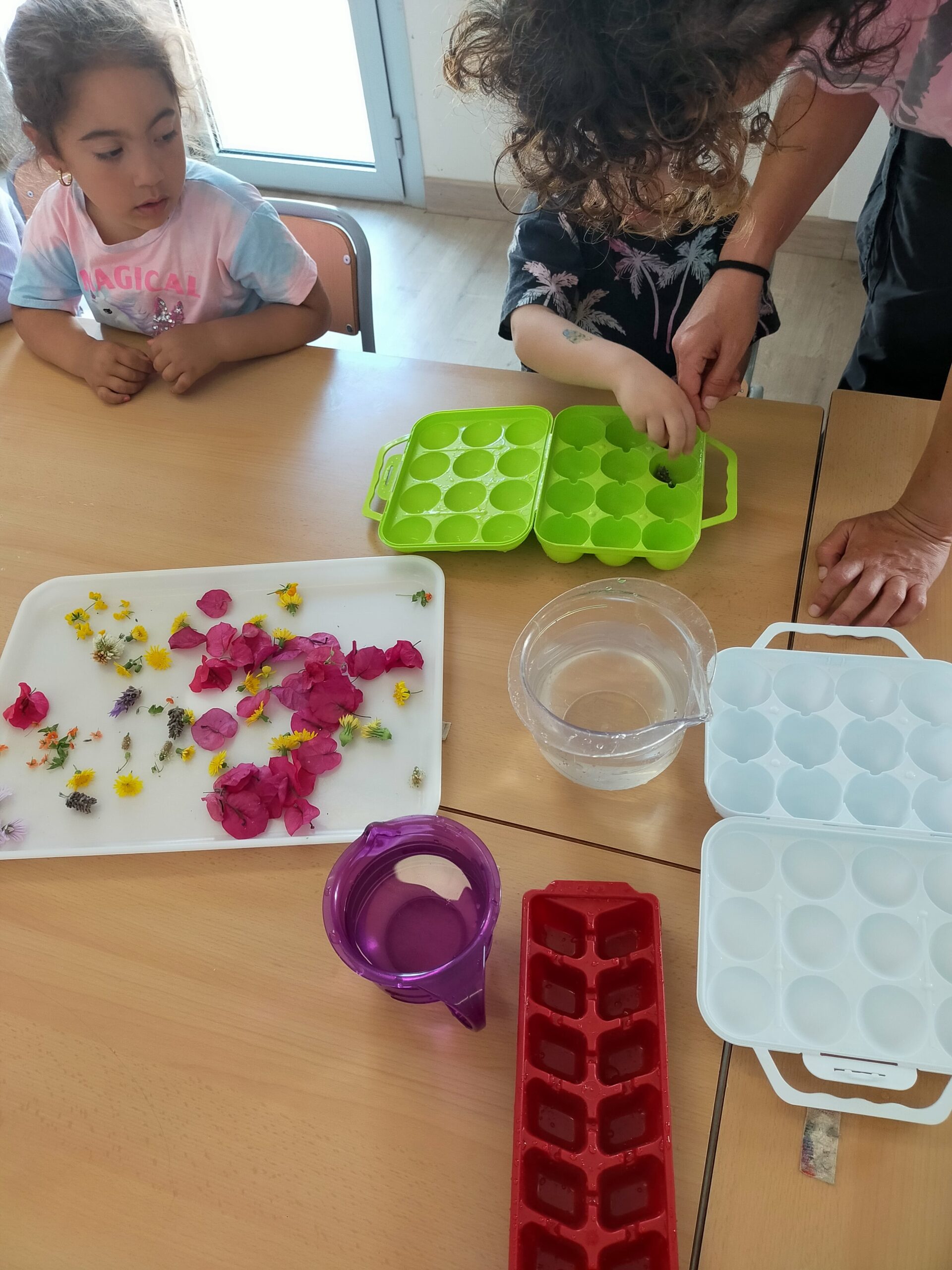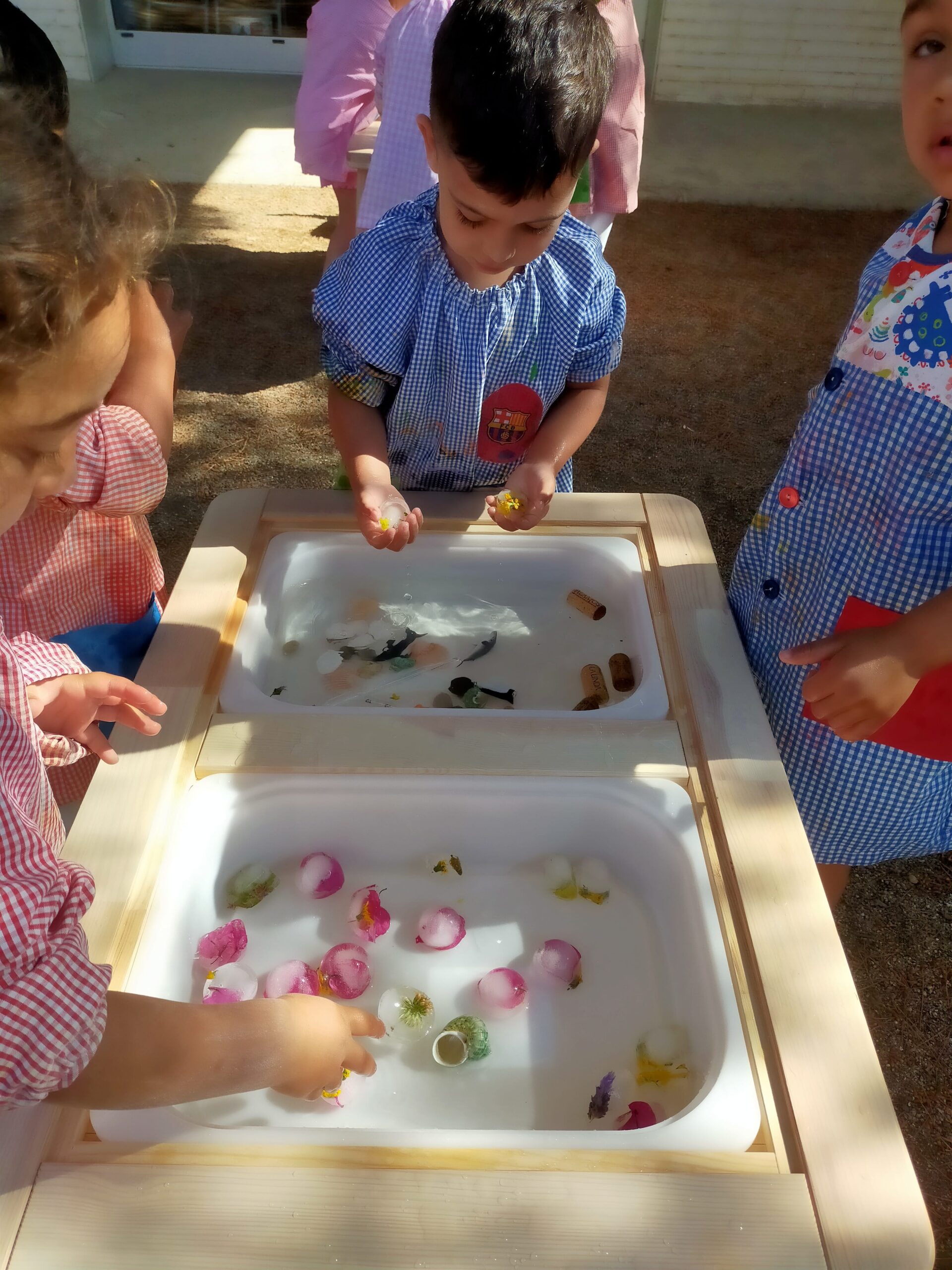 Els infants d’I3 hem anat a buscar flors de primavera pel jardí de l’escola i, després, les hem col·locat a unes glaçoneres, hi hem afegit aigua i cap al congelador. Dies després l’aigua s’ha convertit en glaçons. Així, les nenes i els nens han experimentat amb aigua i glaçons al nostre pati. S’ho han passat d’allò més bé!