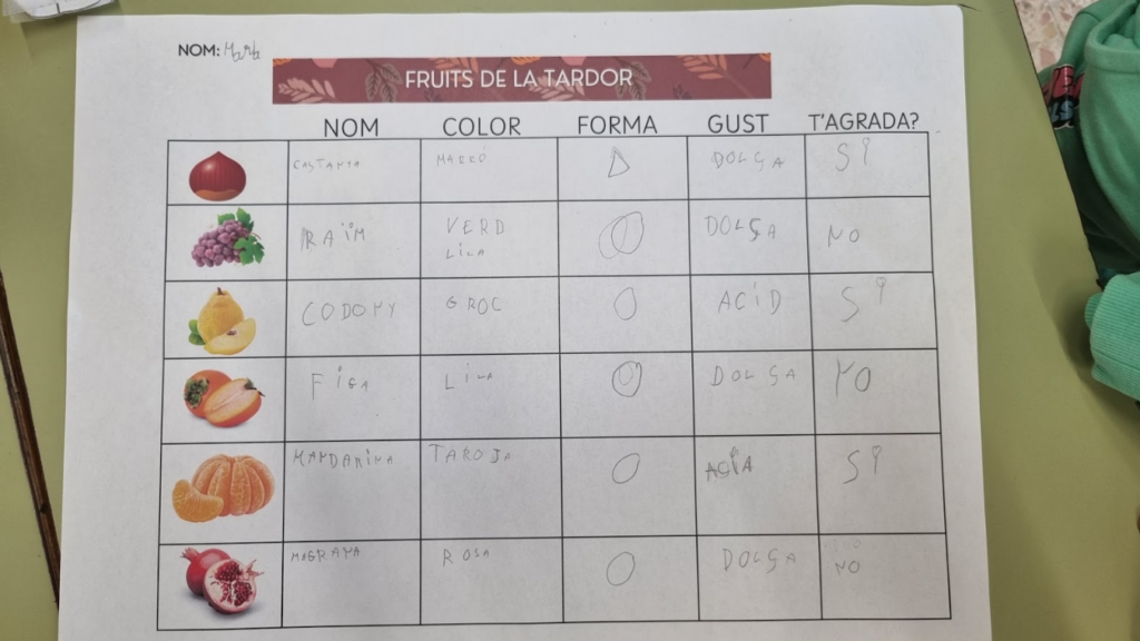 Els nens i les nenes de segon de primària de l’Institut Escola del Prat han tastat alguns fruits de la tardor com ara el raïm, les castanyes, les figues, els caquis, el codony i la mandarina. Alguns els han agradat i d’altres no tant. A més a més, han observat i anotat les seves característiques com ara el color, la forma, el gust i, també, si els si ha agradat o no.