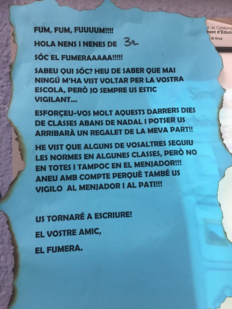 Queden molt poquets dies perquè arribi Nadal i a l’escola ja estem fent moltes activitats. Avui ens ha arribat una carta del Fumera i ens ha dit que ens està vigilant i si ens portem molt bé ens portarà un regal. Estem molt emocionats i ens encanta el Nadal.