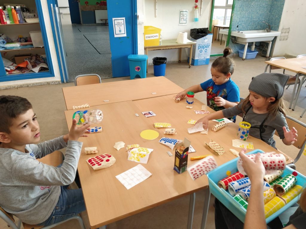 Per tal d’aprofitar les ampolles d’aigua de plàstic, hem creat pots per guardar els llapis i colors a la classe, els hem decorat amb gomets i papers. D’aquesta manera hem après a reutilitzar el material. Mireu que bonics han quedat!