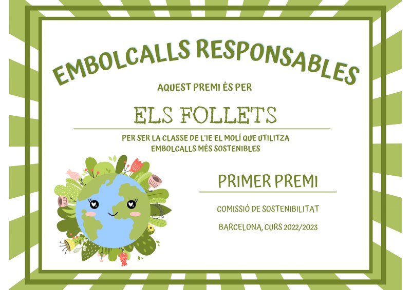 Doncs bé, aquest esforç ha valgut la pena! La comissió de sostenibilitat ens ha entregat a la classe dels follets el primer premi als embolcalls més sostenibles de tota l’escola!!