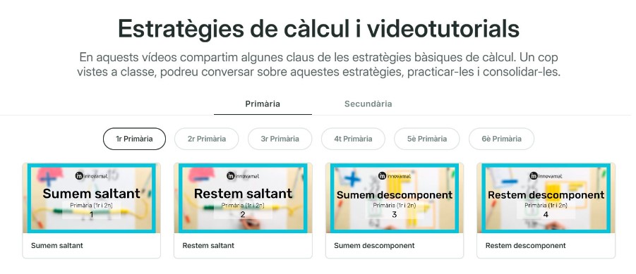 També us facilitem videotutorials que us seran d’utilitat per a acompanyar als vostres fills i filles des de 1r de primària fins a 4t d’ESO. Cliqueu a l’apartat d’estratègies de càlcul i videotutorials, cerqueu l‘etapa educativa i el nivell del vostre fill/a.